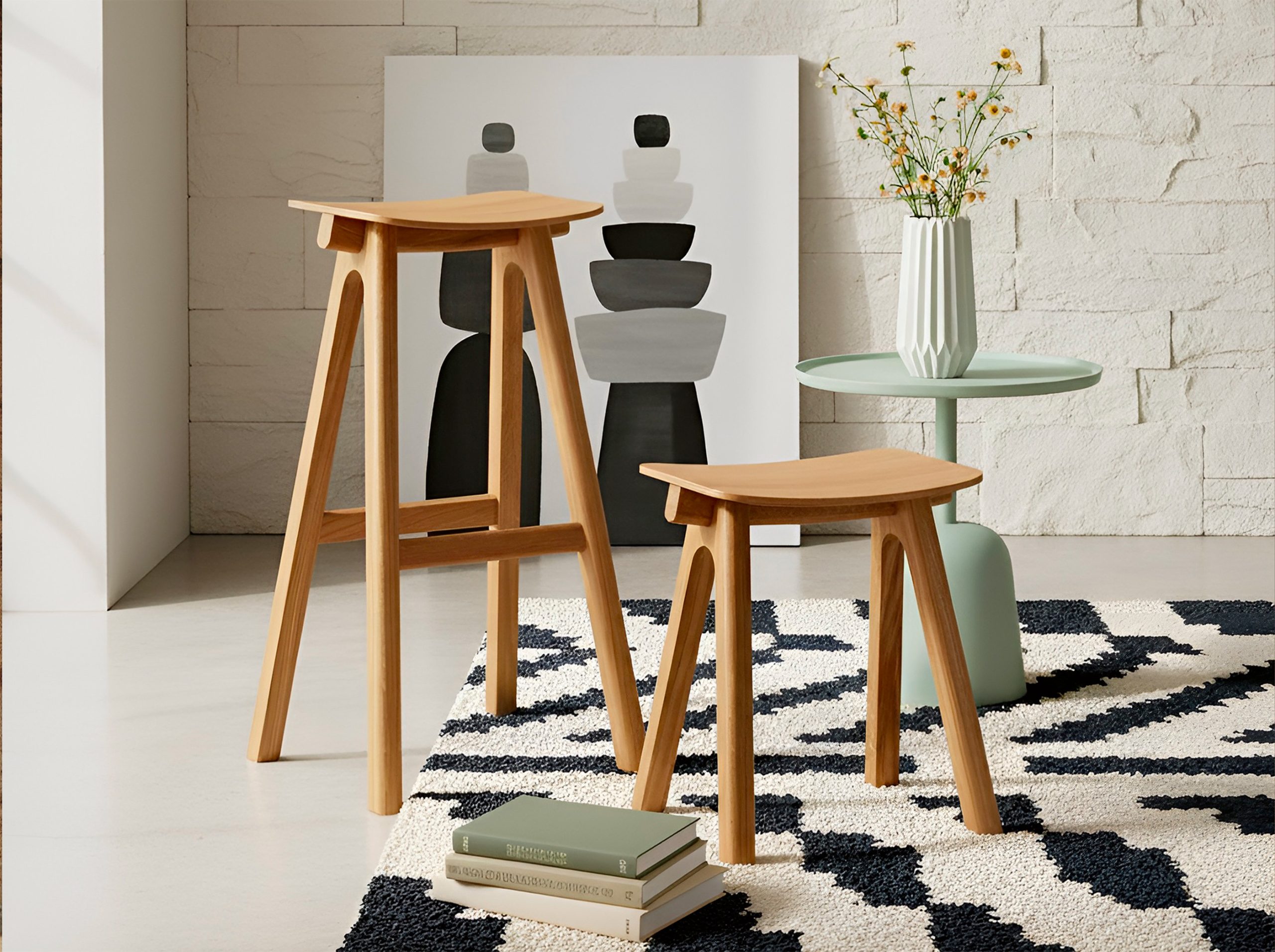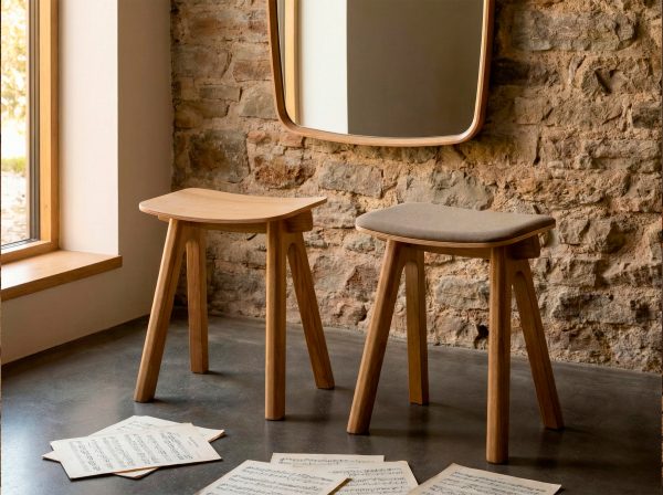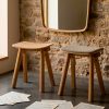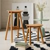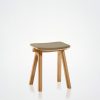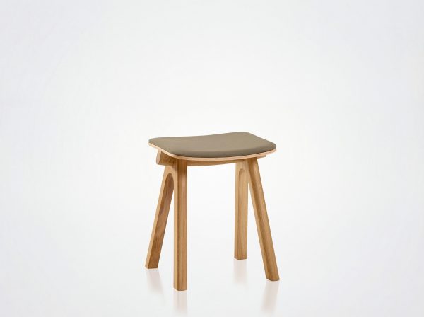 Dieser 45 cm hohe Hocker ist in Eiche erhältlich, mit der Möglichkeit, zwischen einer Sitzfläche aus Holz oder Stoff zu wählen.