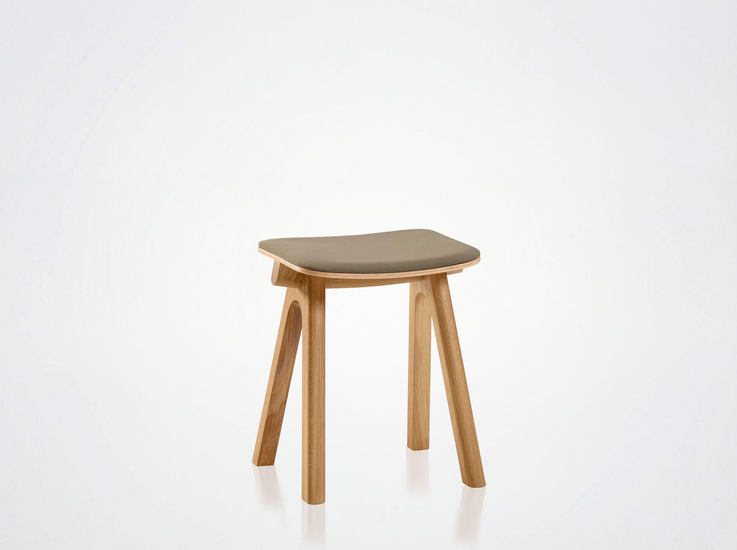Stoffversion: Formgepresste Multiplexschale mit Eichenfurnier auf der Rückseite. Sitzfläche aus 3 mm Multiplex, gepolstert mit 20 mm MH40 Schaumstoff, gepolstert mit einem Bezug Ihrer Wahl.