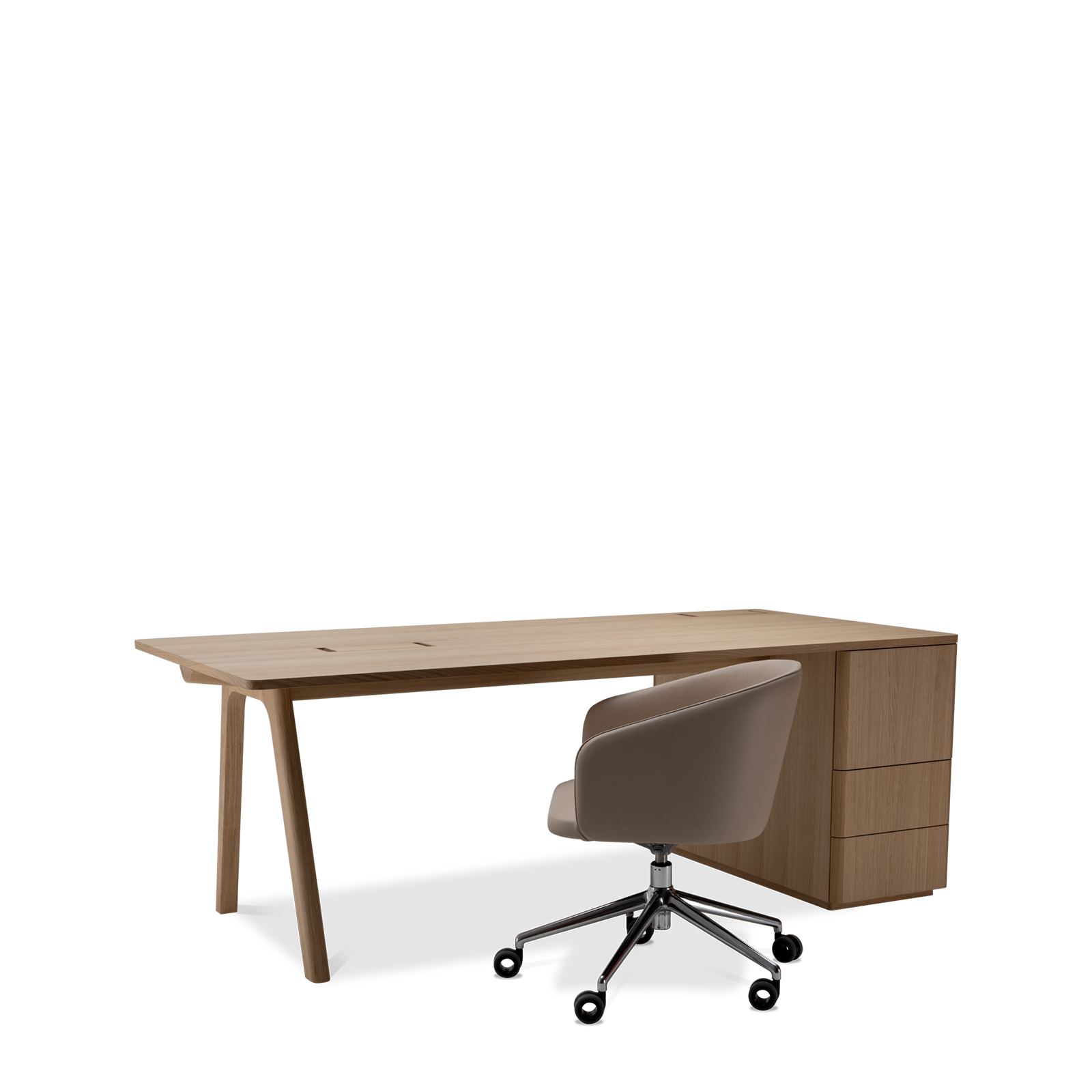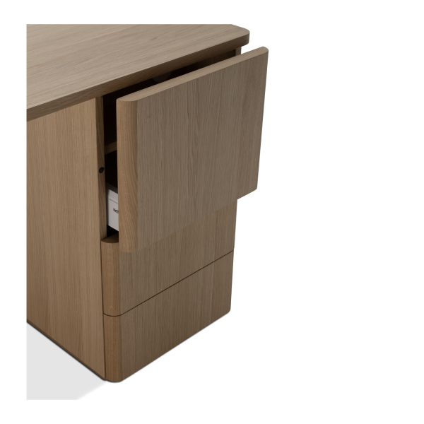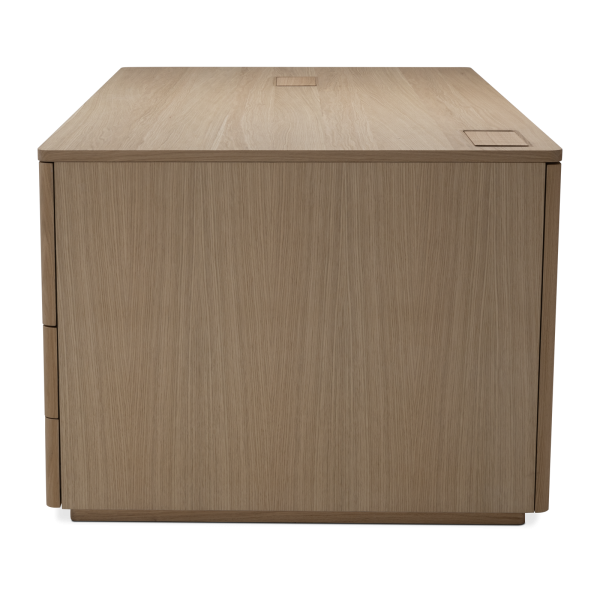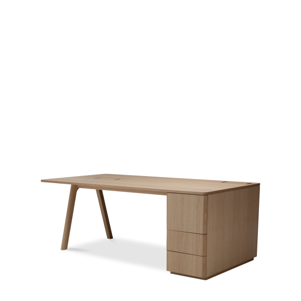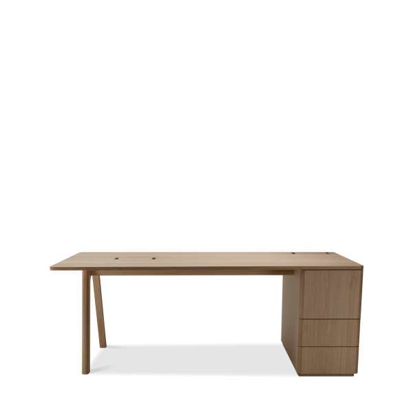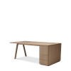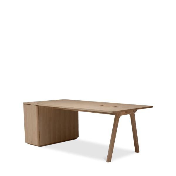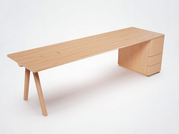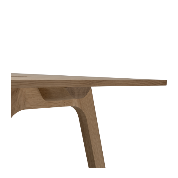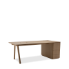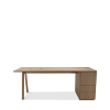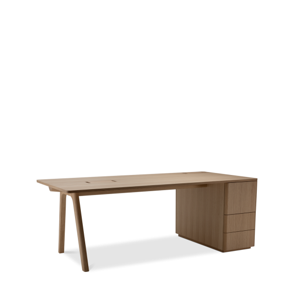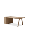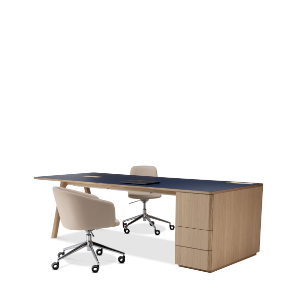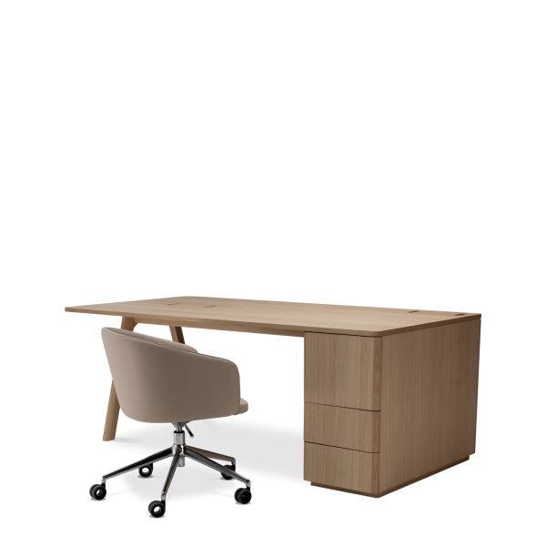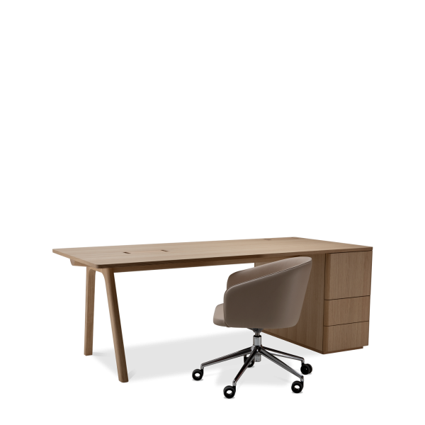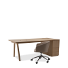 Der Chevron Chefschreibtisch, ein Entwurf des Designers Guillaume Delvigne, verkörpert Einfachheit und Wesentlichkeit in seinem Design. Inspiriert von Elementen der Tischlerei, insbesondere von den Beinen, die an Balken erinnern, vereint dieser große Schreibtisch Zweckmäßigkeit und Ästhetik, um sich in jeden Raum einzufügen.