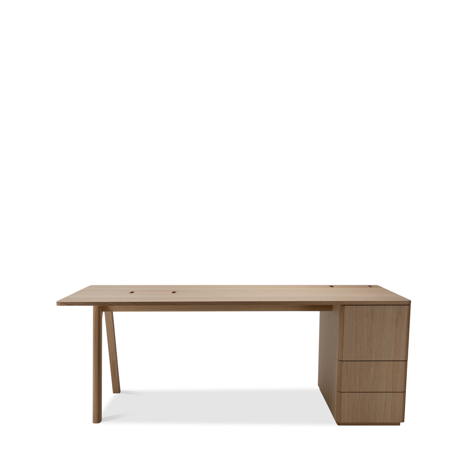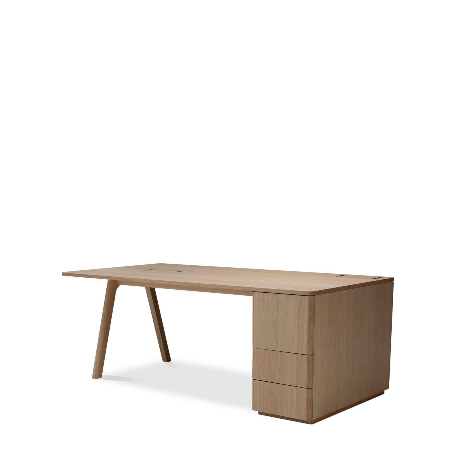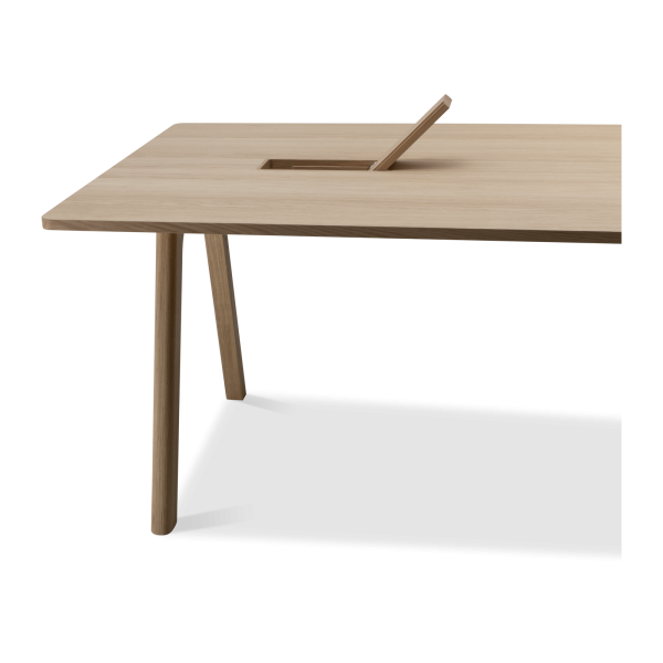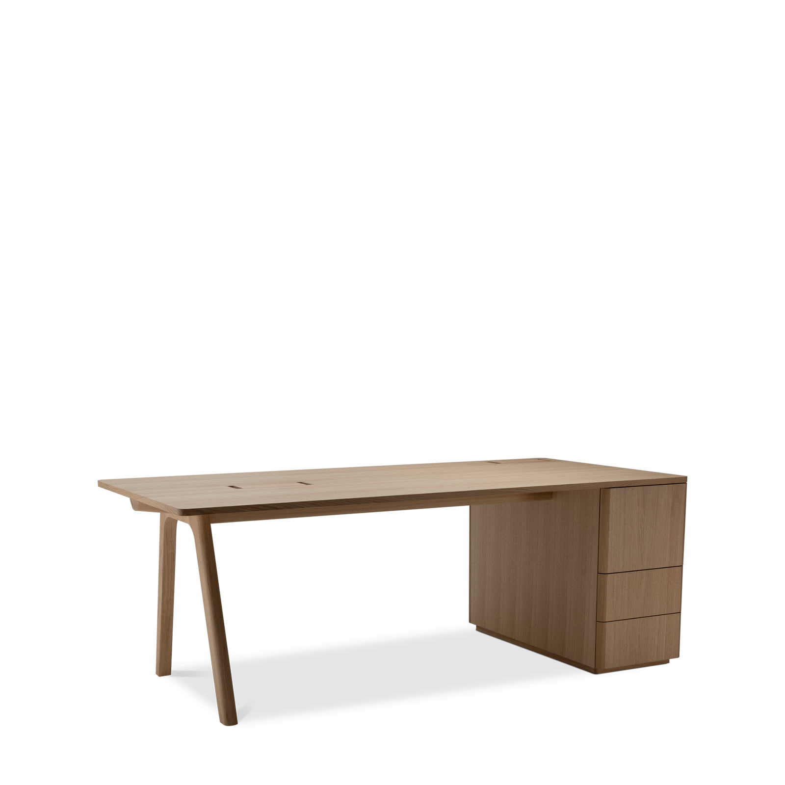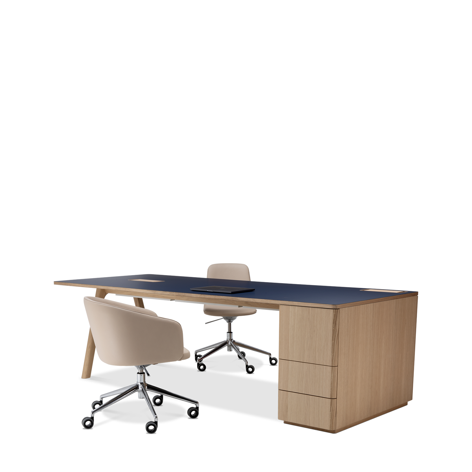 Der Chevron Chefschreibtisch, ein Entwurf des Designers Guillaume Delvigne, verkörpert Einfachheit und Wesentlichkeit in seinem Design. Inspiriert von Elementen der Tischlerei, insbesondere von den Beinen, die an Balken erinnern, vereint dieser große Schreibtisch Zweckmäßigkeit und Ästhetik, um sich in jeden Raum einzufügen.