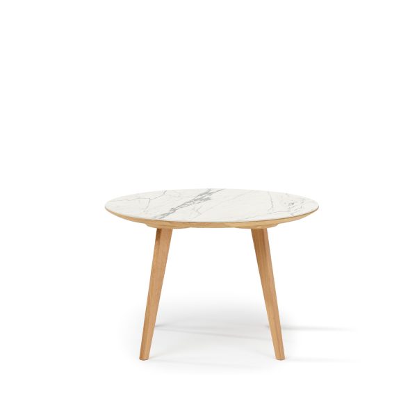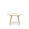 Ein Duo aus einem runden und einem ovalen Tisch mit spitz zulaufenden Beinen, die unendlich viele Möglichkeiten für Materialkombinationen bieten. Sie können sich für einen Tisch ganz aus Holz, einen Holztisch mit Keramikplatte oder zwei Tische ganz aus Keramik in verschiedenen Größen entscheiden.