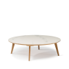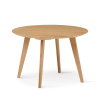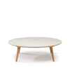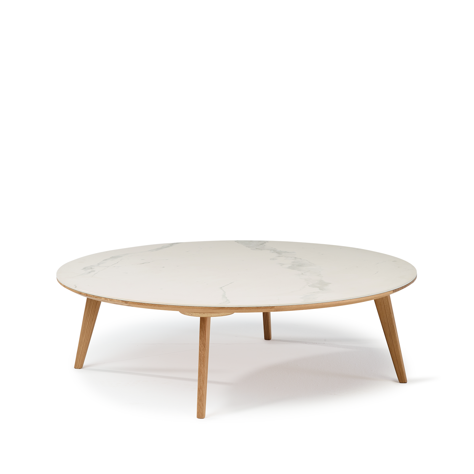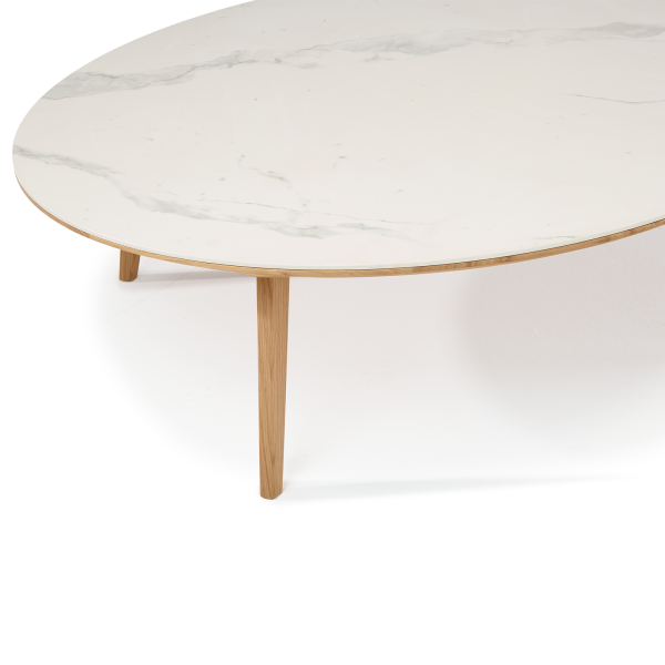 Ein Duo aus einem runden und einem ovalen Tisch mit spitz zulaufenden Beinen, die unendlich viele Möglichkeiten für Materialkombinationen bieten. Sie können sich für einen Tisch ganz aus Holz, einen Holztisch mit Keramikplatte oder zwei Tische ganz aus Keramik in verschiedenen Größen entscheiden.