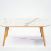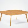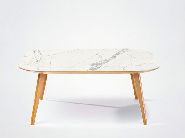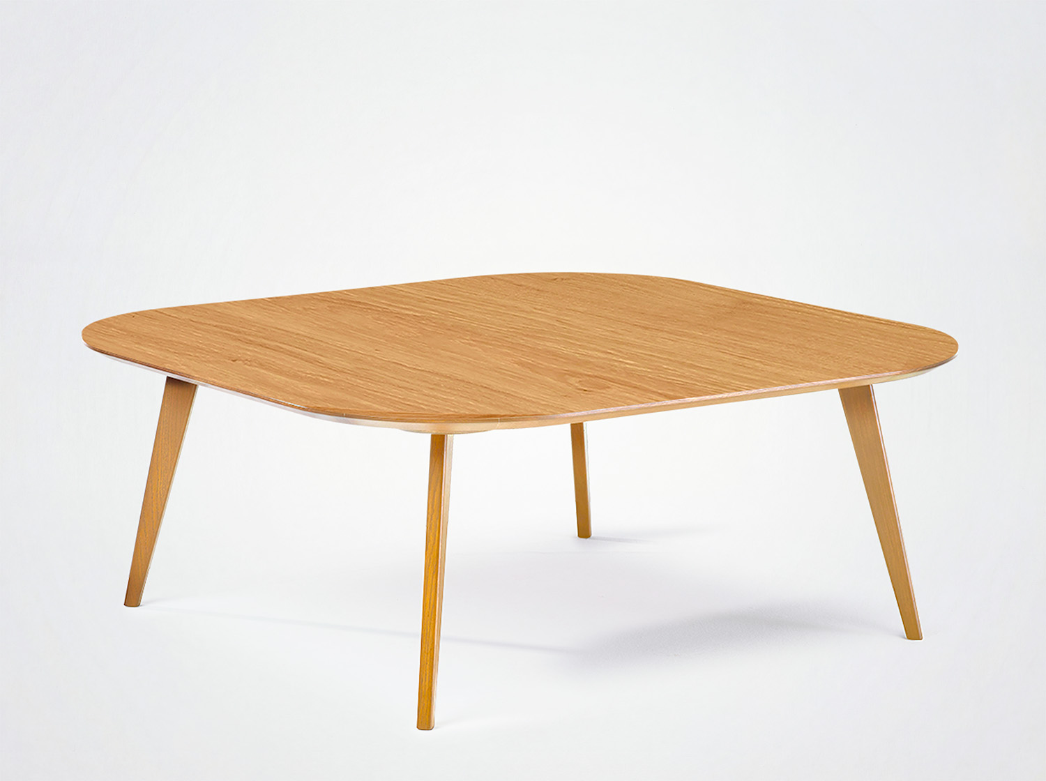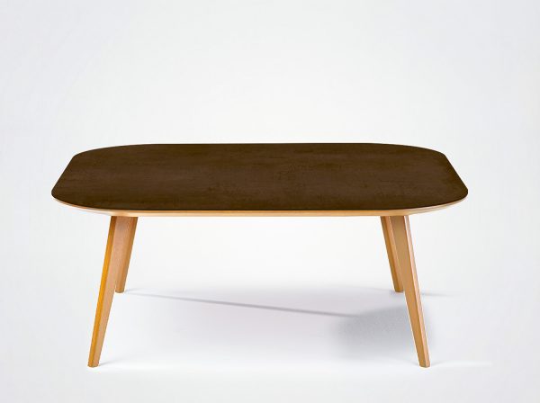 Beine aus Massivholz, Tischplatte mit Flugzeugflügelkante (M5).