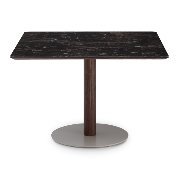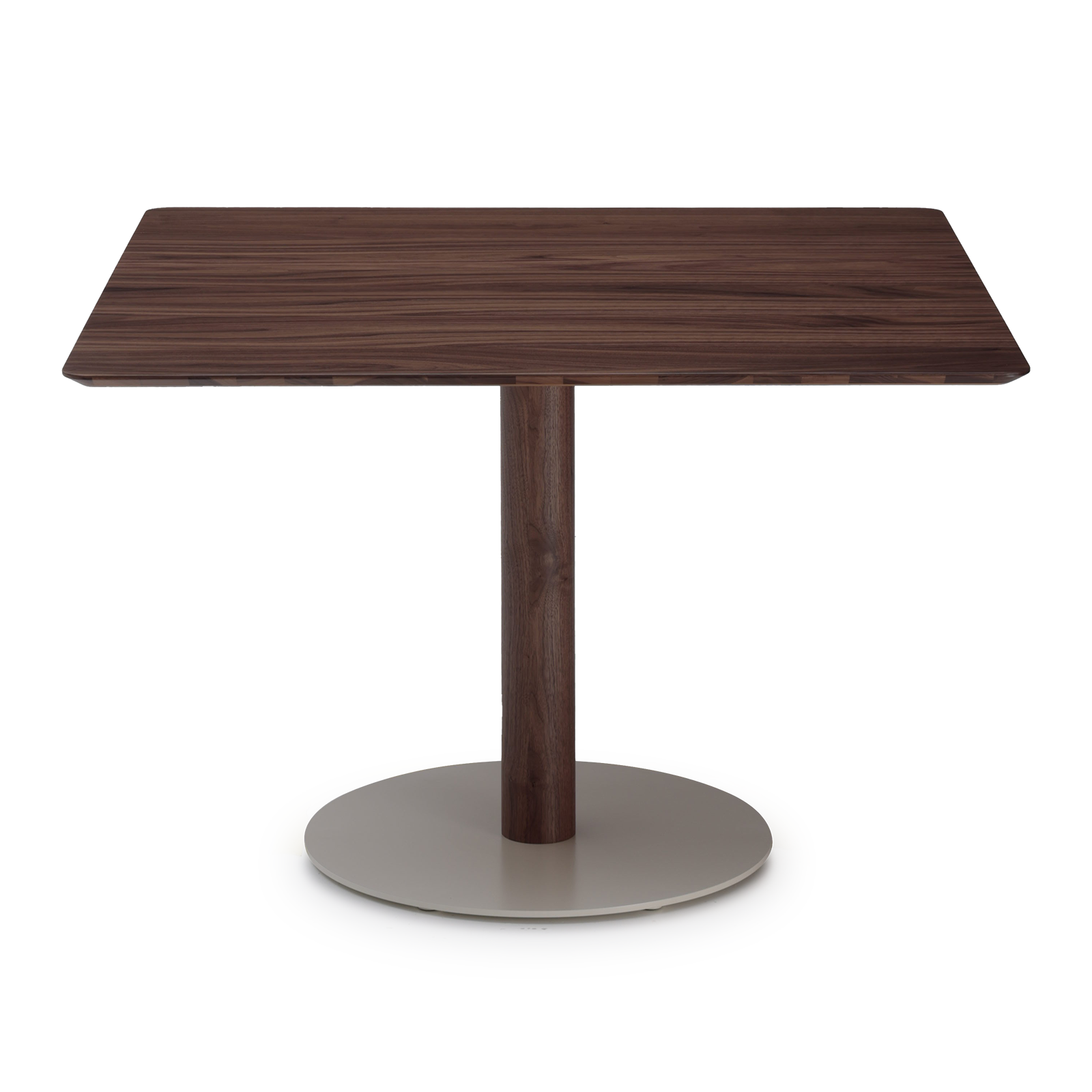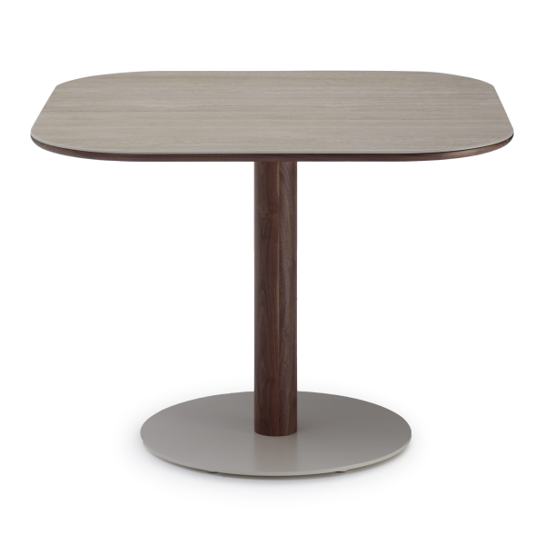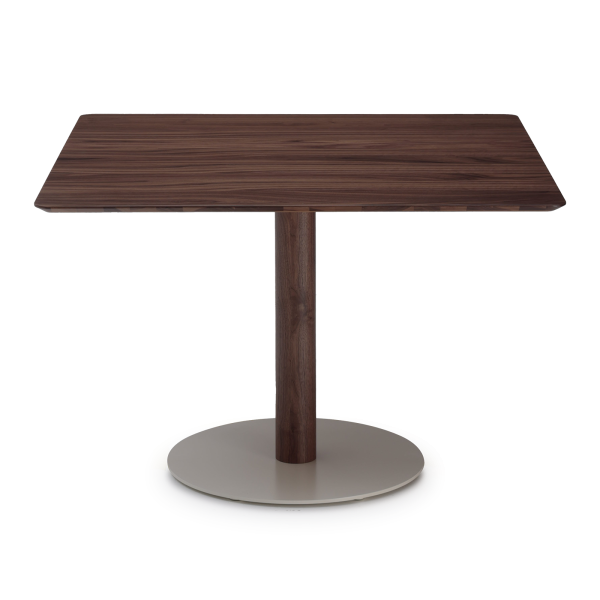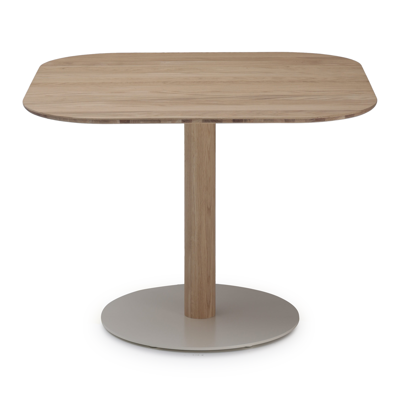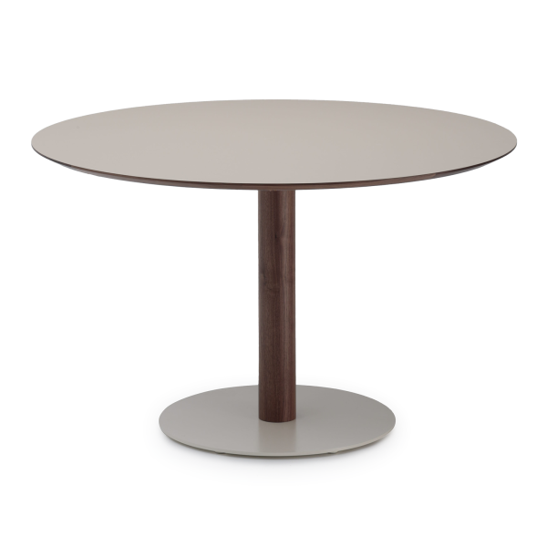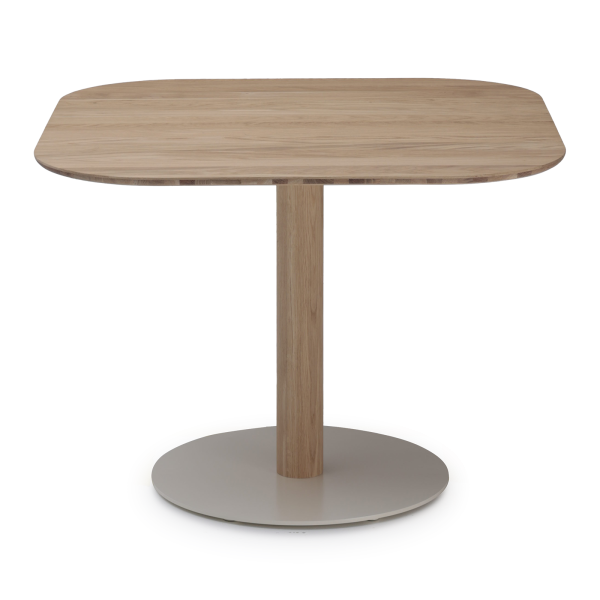 Fußstruktur aus pulverbeschichtetem Stahl in der RAL-Farbe Ihrer Wahl. Runde Säule aus Massivholz.