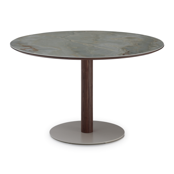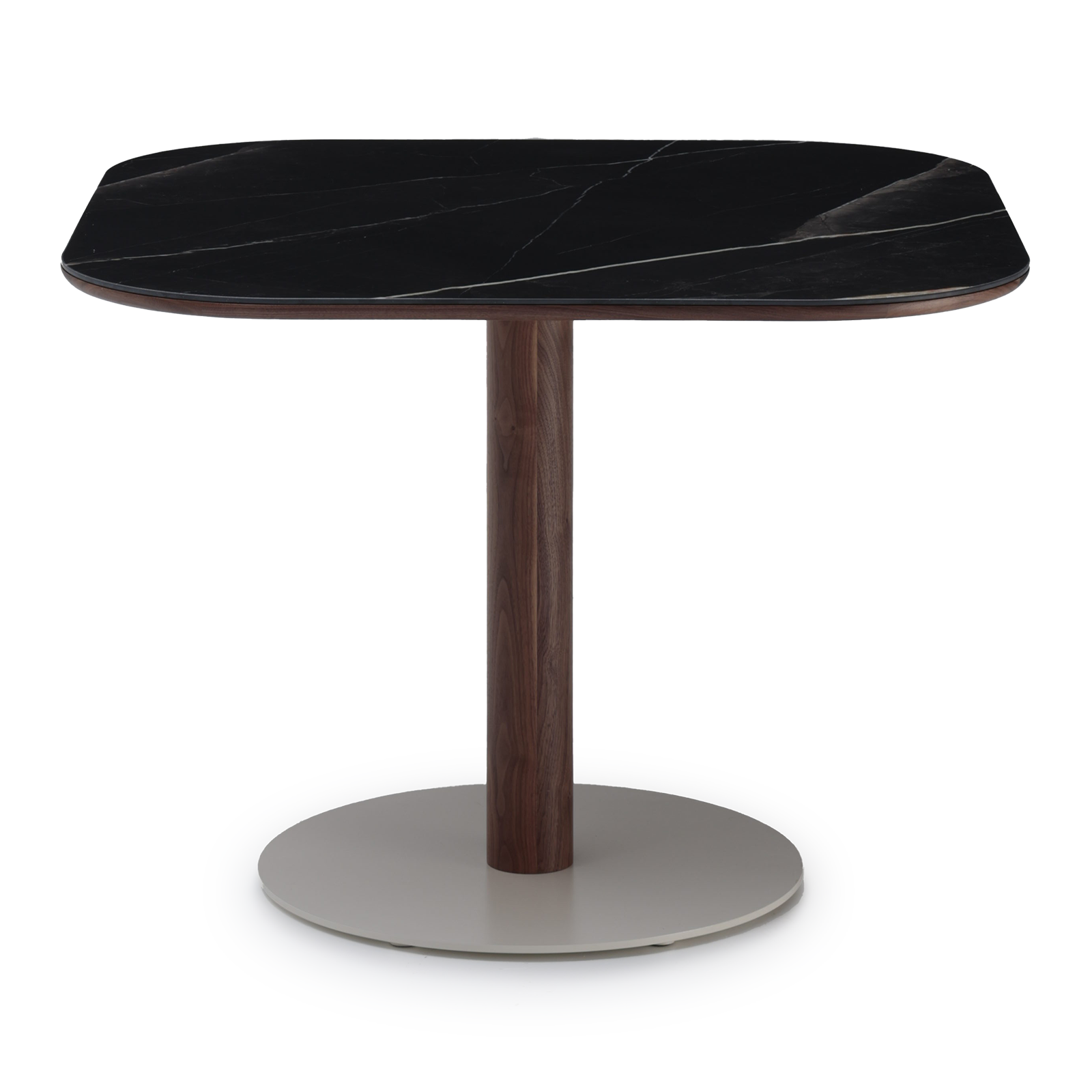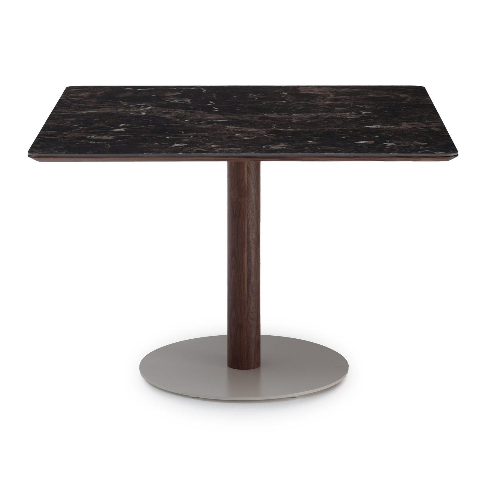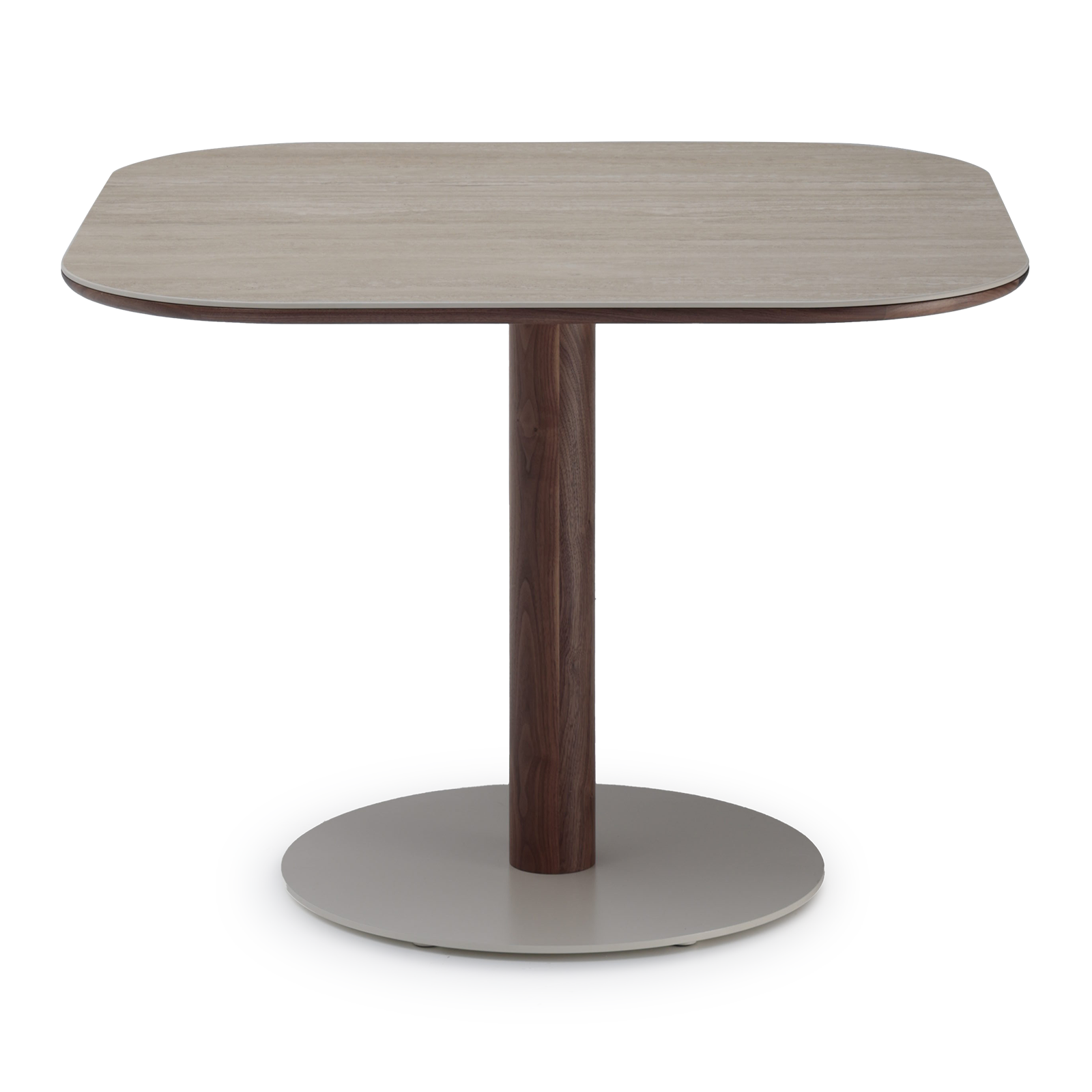 Fußstruktur aus pulverbeschichtetem Stahl in der RAL-Farbe Ihrer Wahl. Runde Säule aus Massivholz.