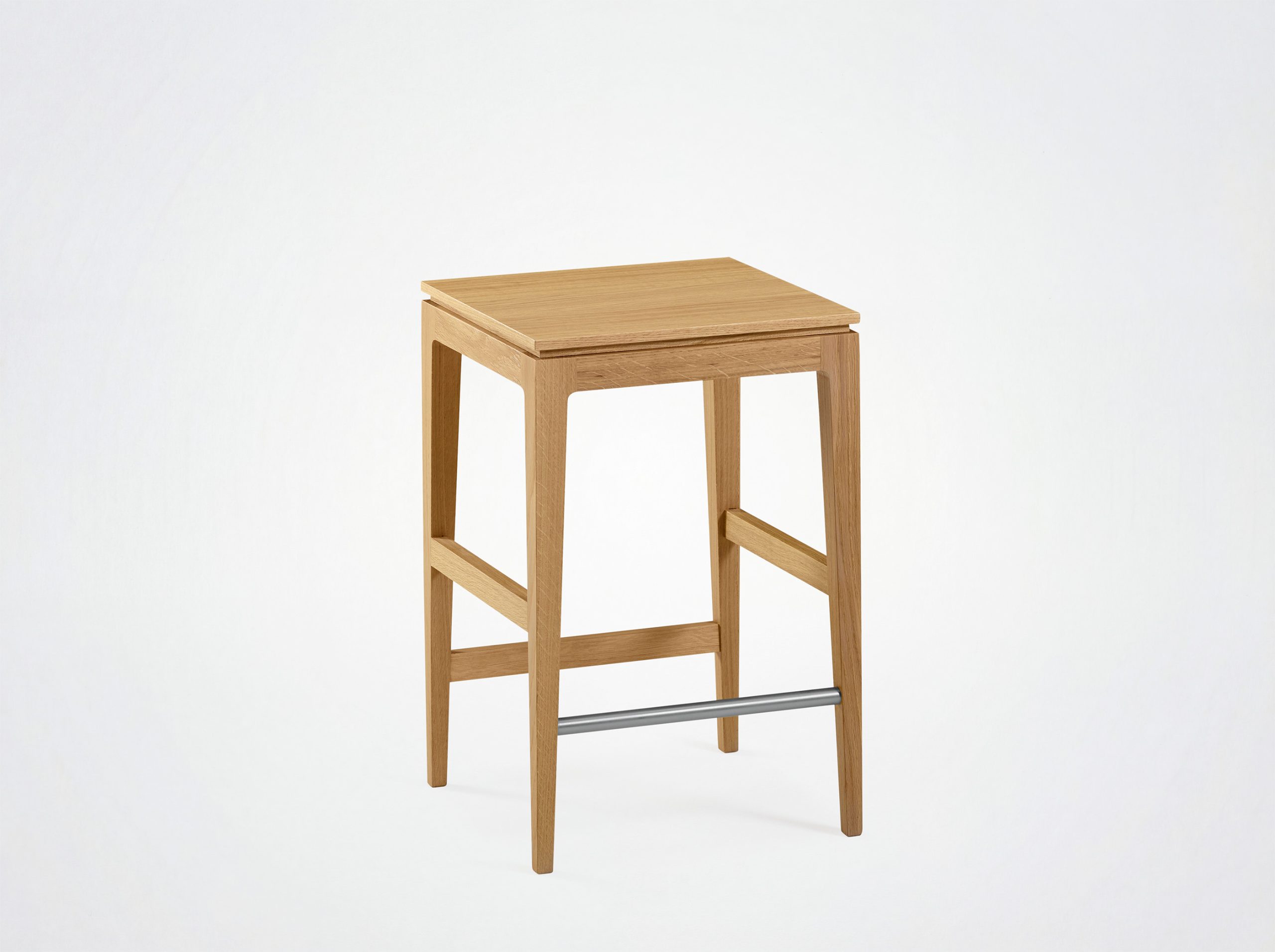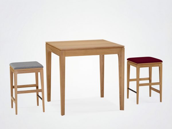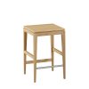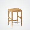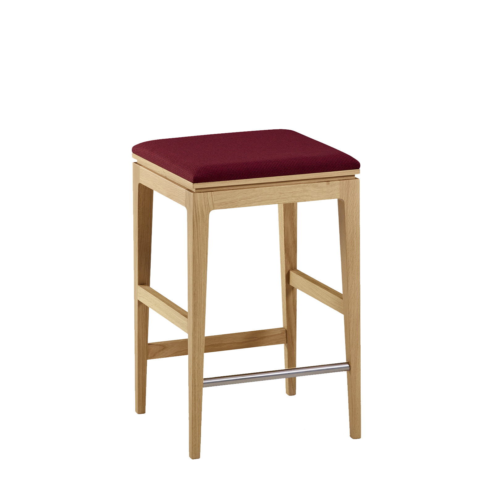 Dieser 60 cm hohe Hocker ist in zwei Holzarten erhältlich, mit der Möglichkeit, zwischen Sitzflächen aus Holz oder hochwertigem Stoff zu wählen. Er passt perfekt in verschiedene Räume, sei es um eine Bar, eine Kücheninsel oder als Beistellstuhl an einem Stehtisch.