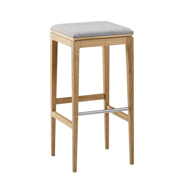 Dieser 80 cm hohe Hocker ist in zwei Holzarten erhältlich, mit der Möglichkeit, zwischen Sitzflächen aus Holz oder hochwertigem Stoff zu wählen. Er passt perfekt in verschiedene Räume, sei es um eine Bar, eine Kücheninsel oder als Beistellstuhl an einem Stehtisch.