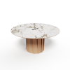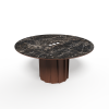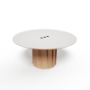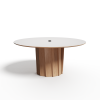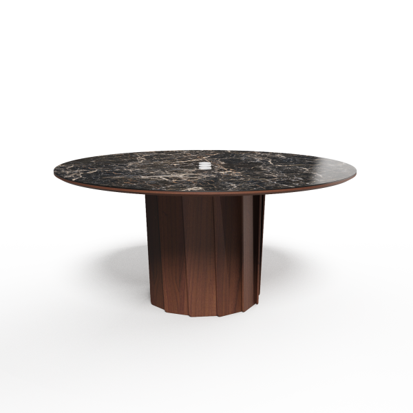 Der Tisch Volute ist ein starkes Stück mit einem besonderen Design: seine Linie wurde von dem französischen Designer Pierre Dubourg entworfen, der den Bistrotisch, einen Klassiker des französischen Lebensgefühls, neu interpretieren wollte. Der Tisch hat eine runde Tischplatte und einen zentralen Fuß. Dieser Fuß ist eine große technische und ästhetische Innovation: Er besteht aus einer Reihe von Massivholzleisten, die einen kinetischen Effekt erzeugen, indem sie Licht- und Schattenspiele abwechseln.