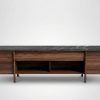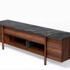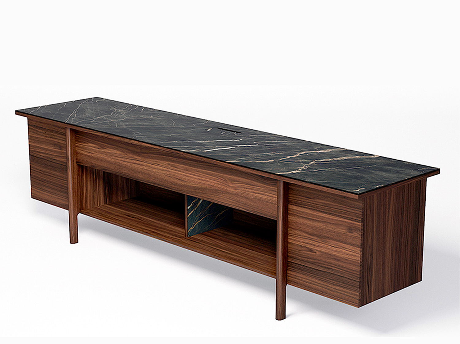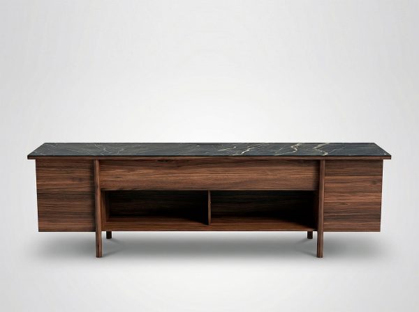 Das Stilt Aufbewahrungsmöbel kann sowohl als Lowboard als auch als TV-Aufbewahrungsmöbel verwendet werden. Die schwarze Marmorkeramik verleiht dem Schrank eine moderne Ästhetik und macht ihn sehr pflegeleicht.