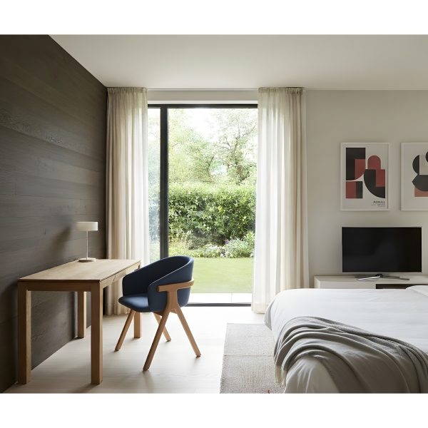 Der Stuhl Eora kombiniert Designstil mit Vintage-Einflüssen. Die breite, umhüllende Rückenlehne und die weichen, klaren Linien betonen die Kraft des Holzes.