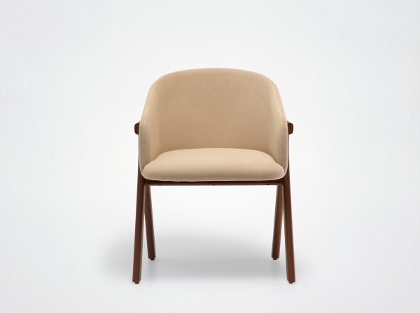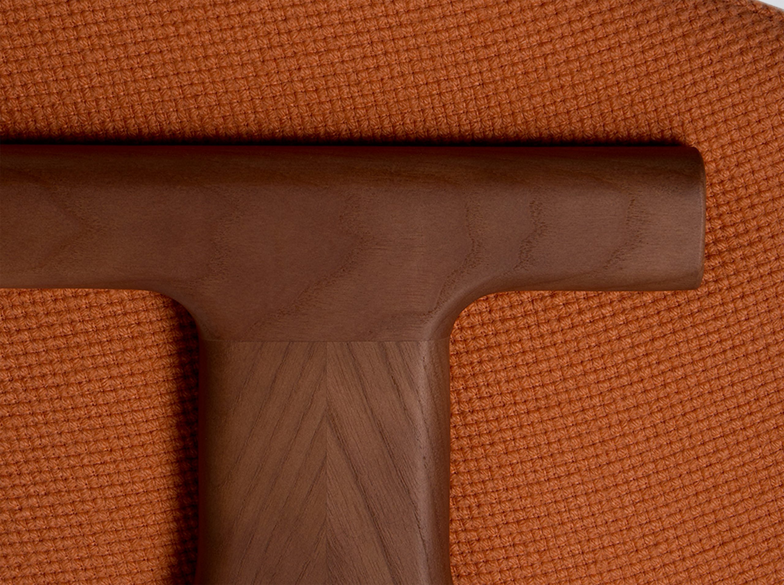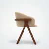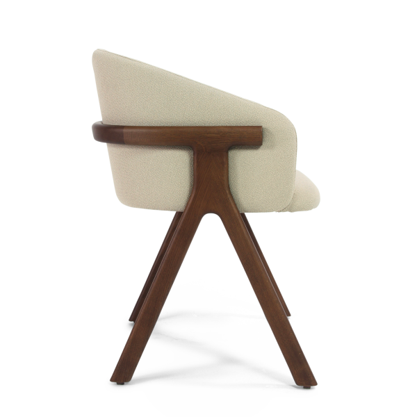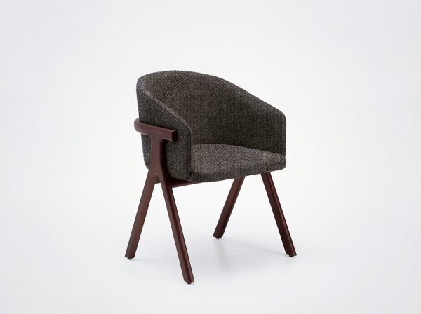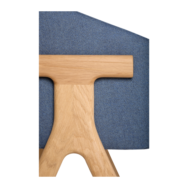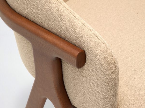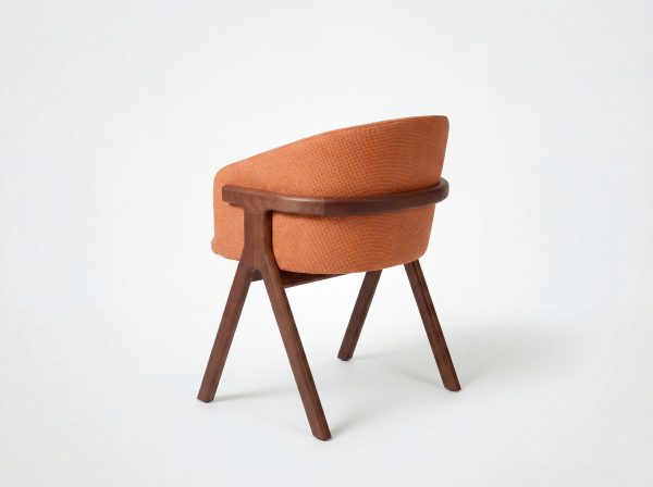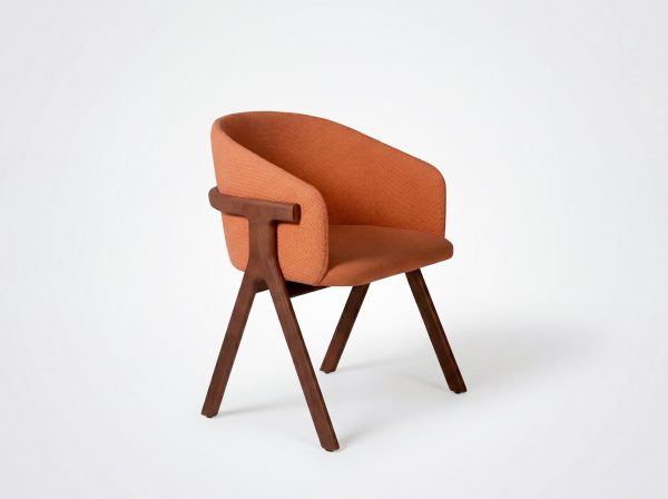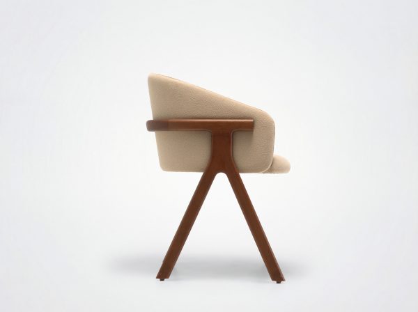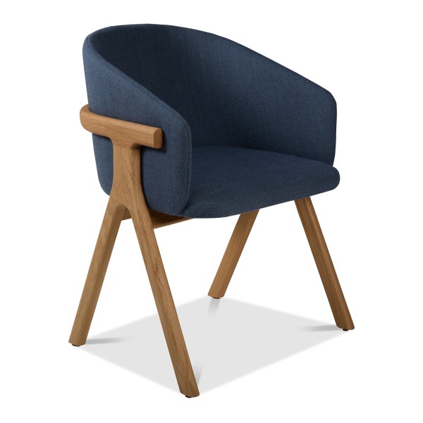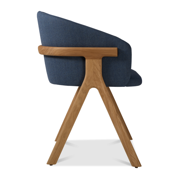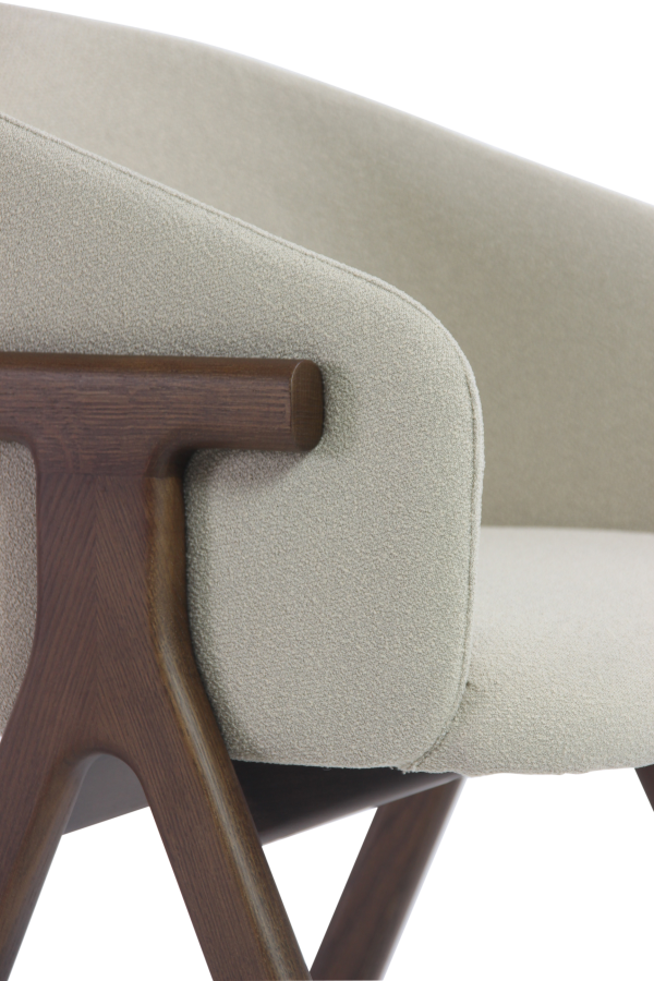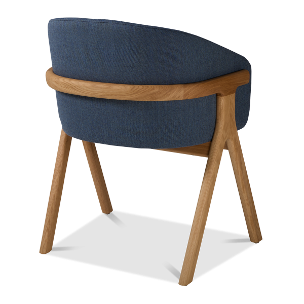 Der Stuhl Eora kombiniert Designstil mit Vintage-Einflüssen. Die breite, umhüllende Rückenlehne und die weichen, klaren Linien betonen die Kraft des Holzes.