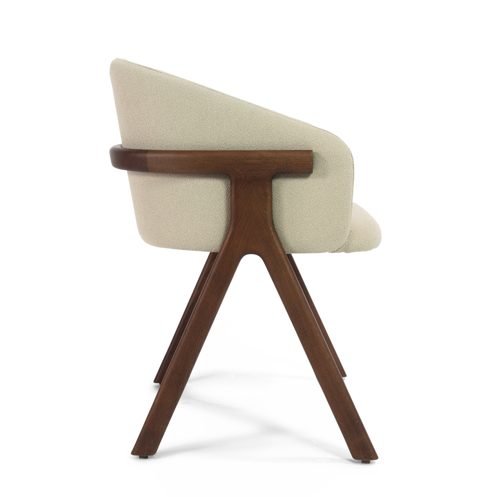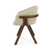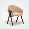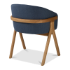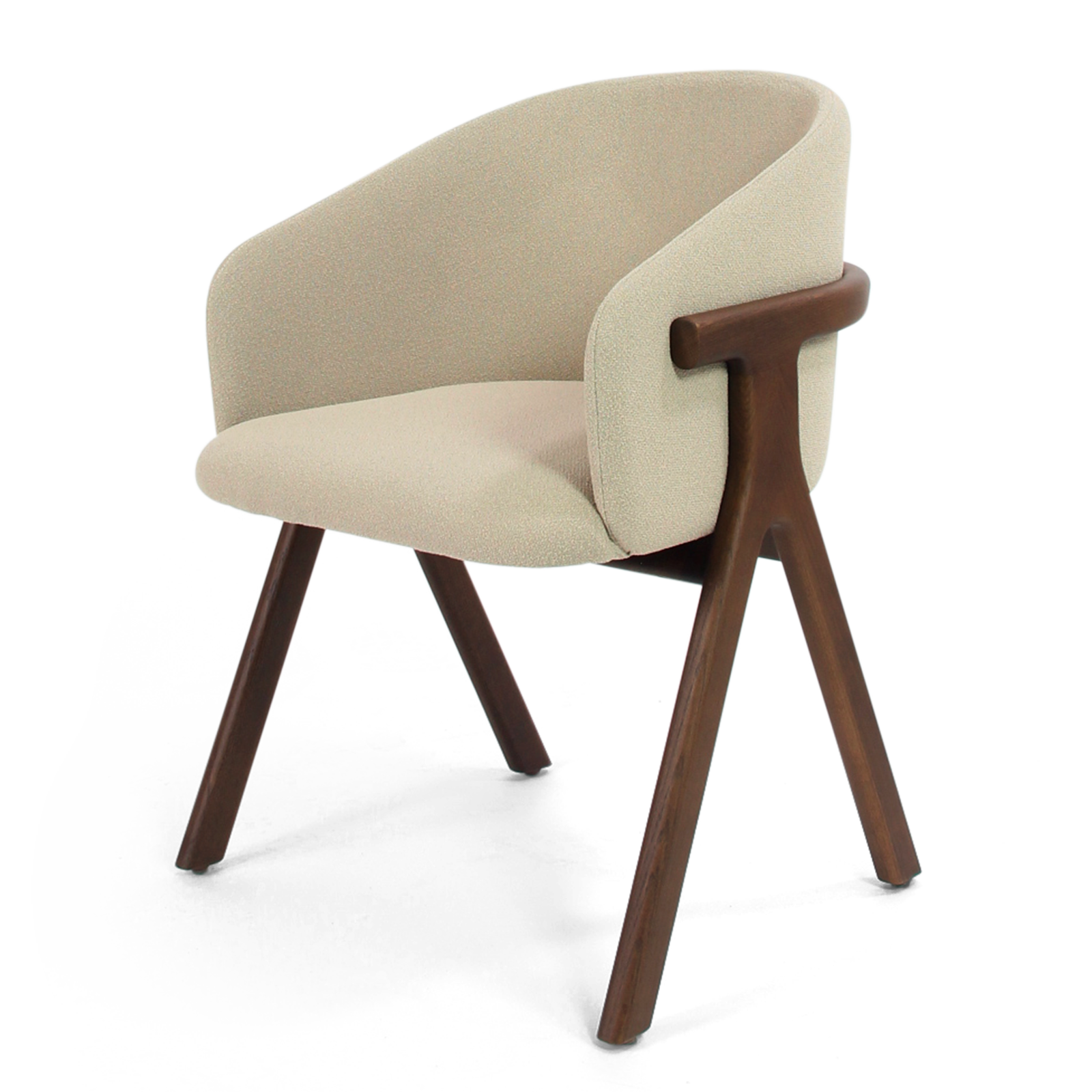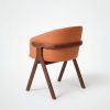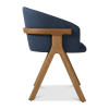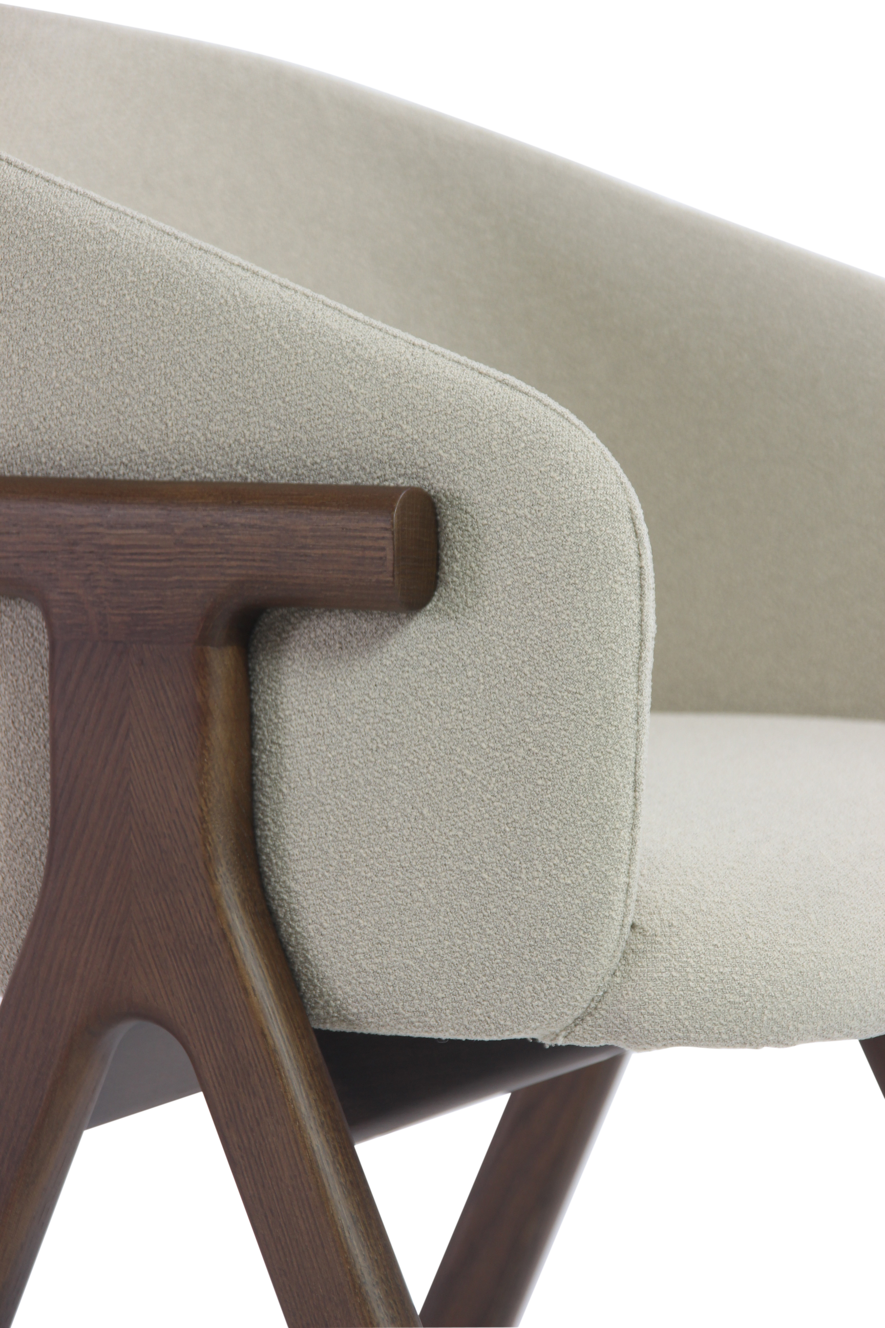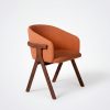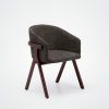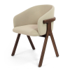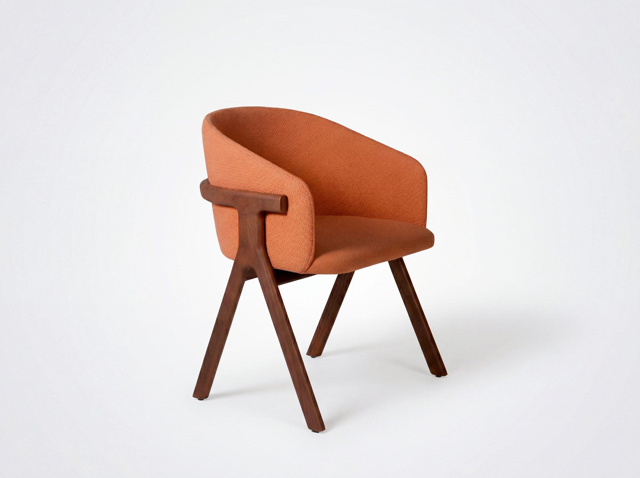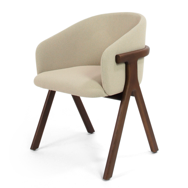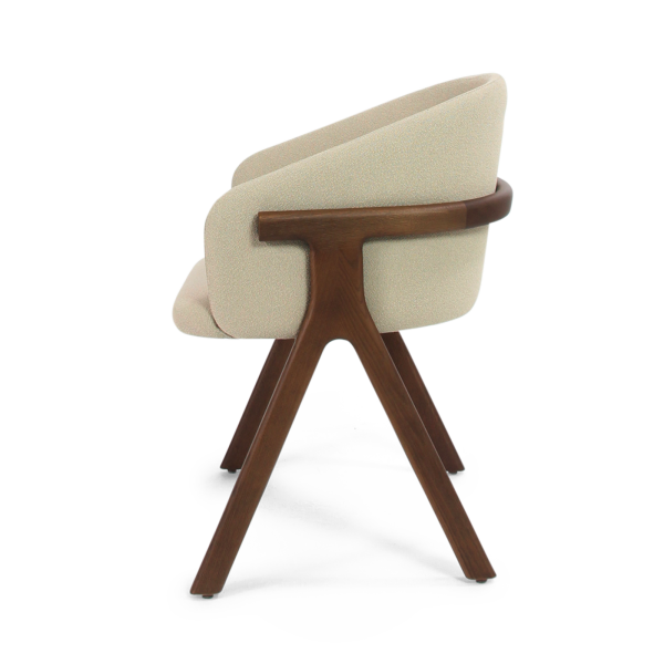 Der Stuhl Eora kombiniert Designstil mit Vintage-Einflüssen. Die breite, umhüllende Rückenlehne und die weichen, klaren Linien betonen die Kraft des Holzes.