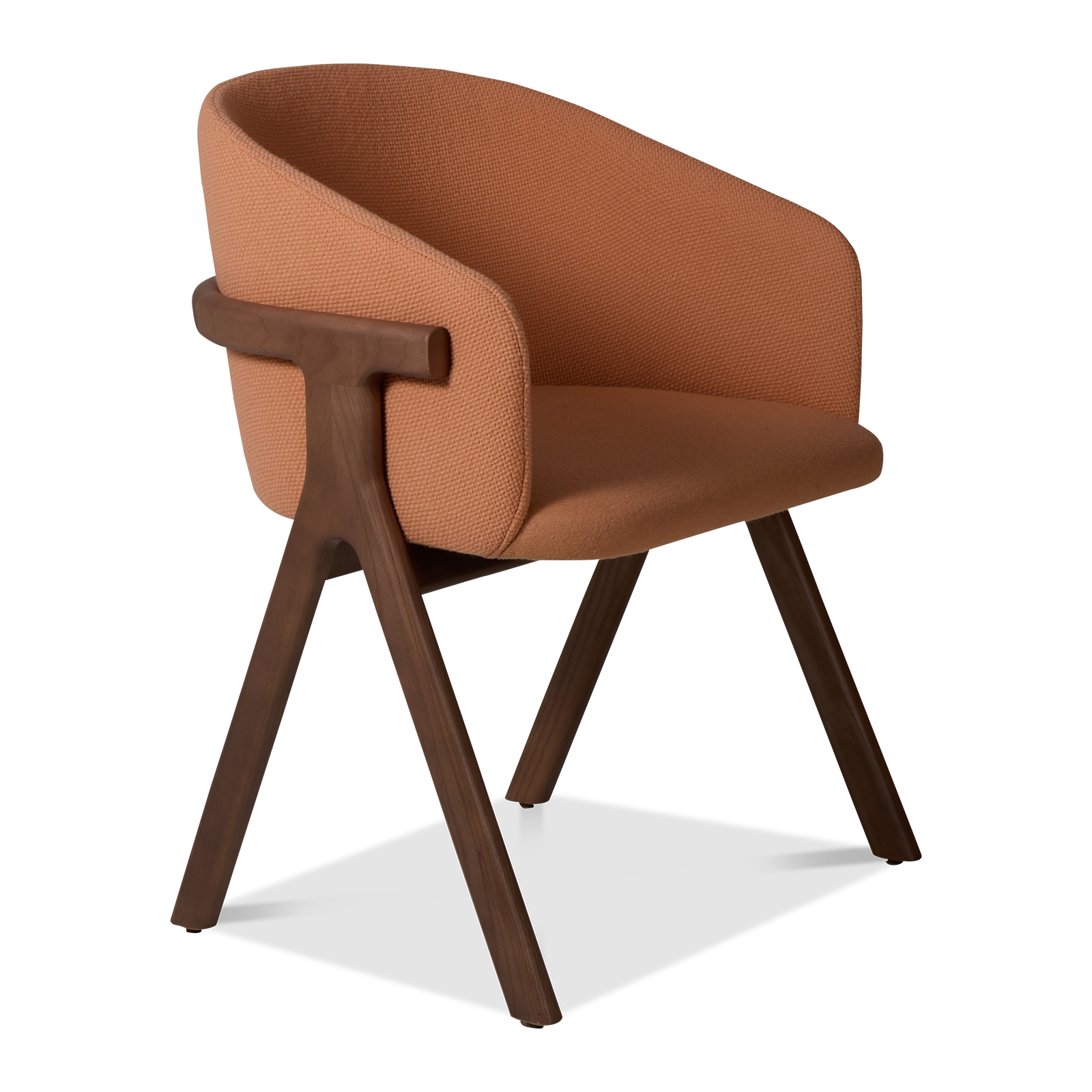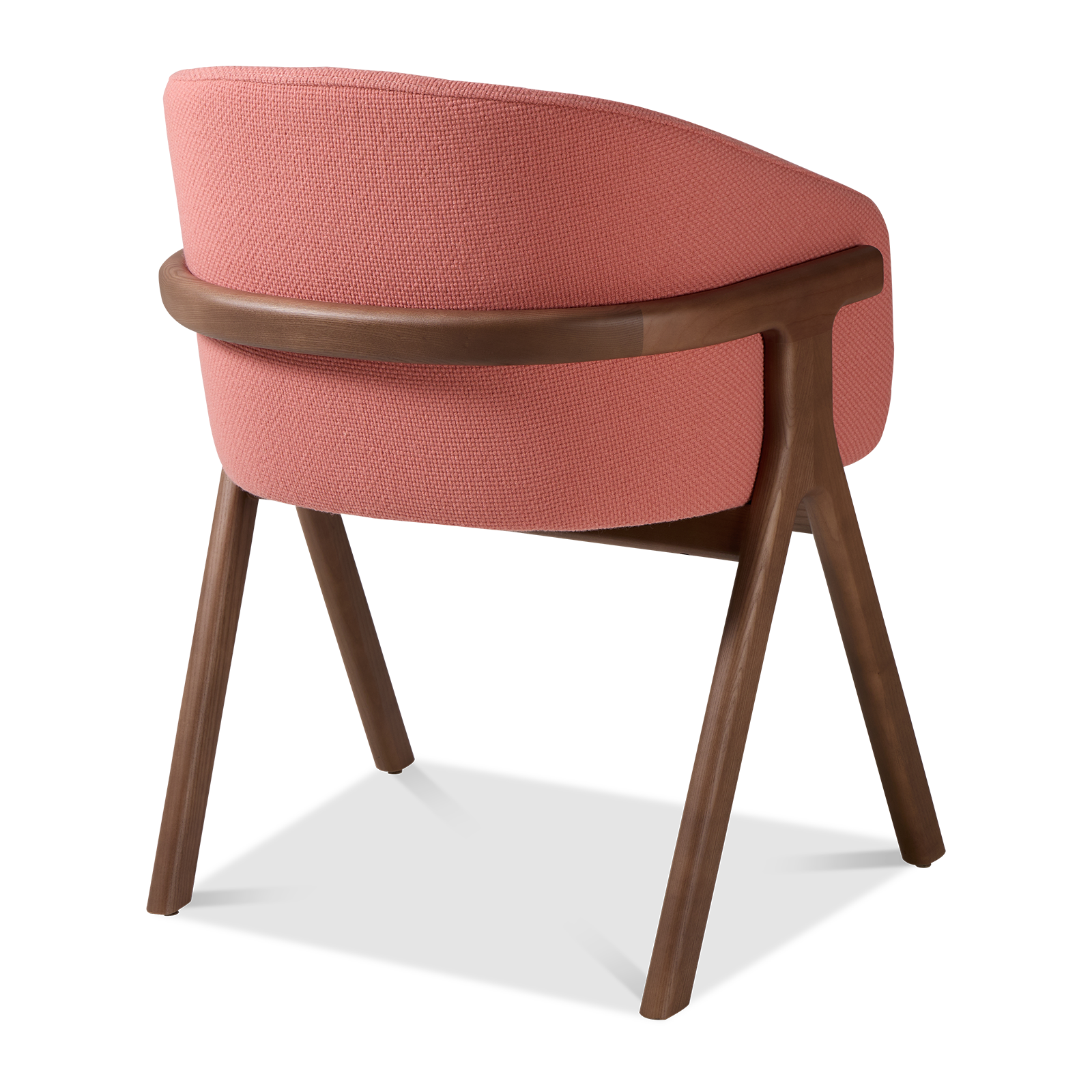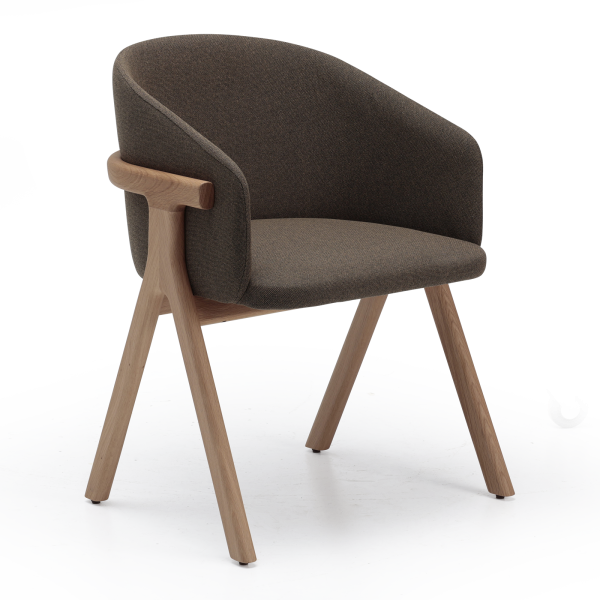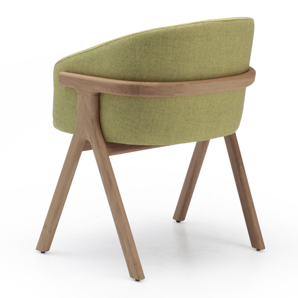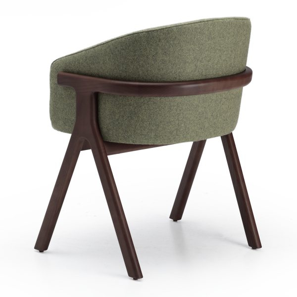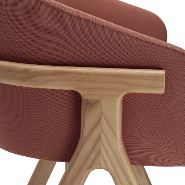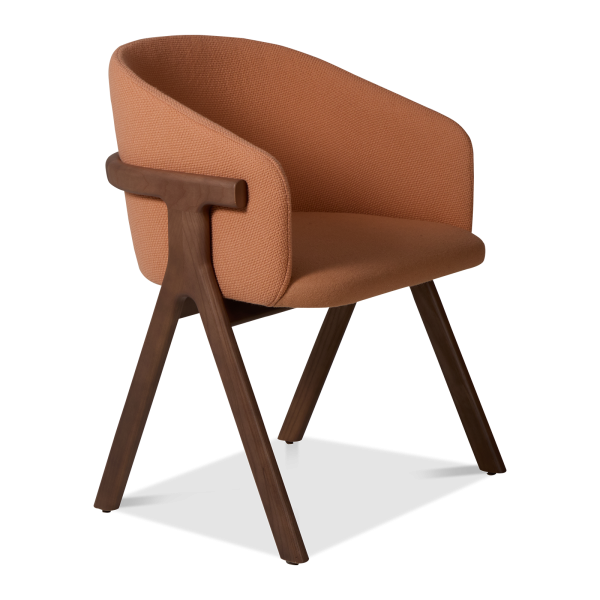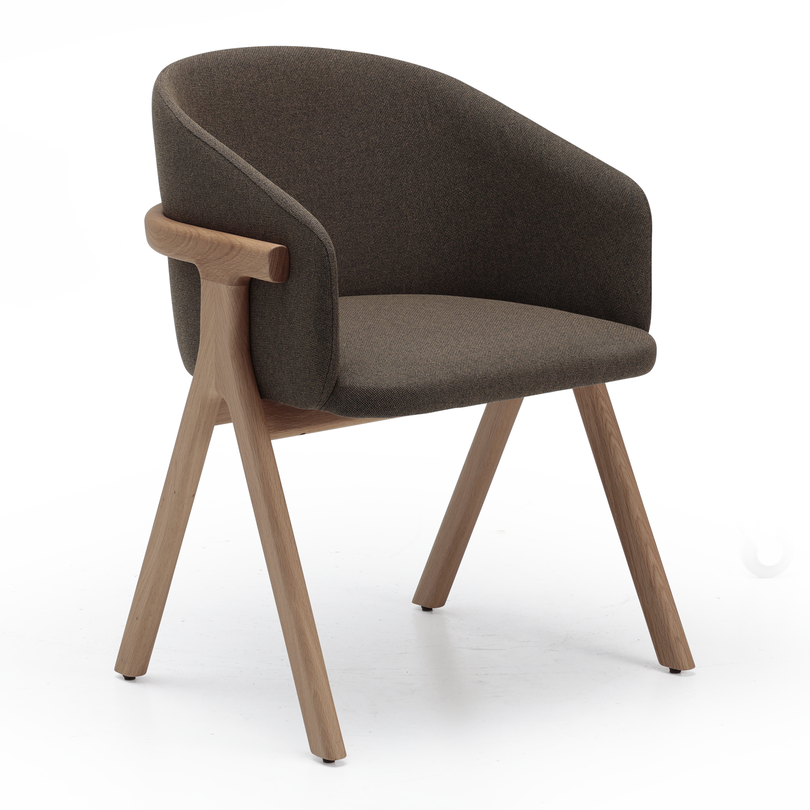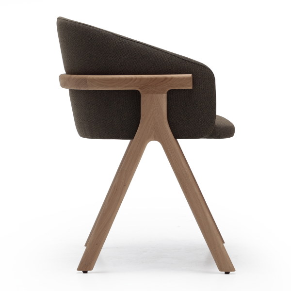 Der Stuhl Eora kombiniert Designstil mit Vintage-Einflüssen. Die breite, umhüllende Rückenlehne und die weichen, klaren Linien betonen die Kraft des Holzes.