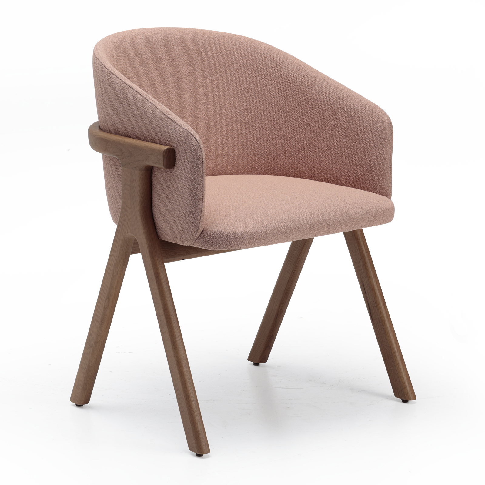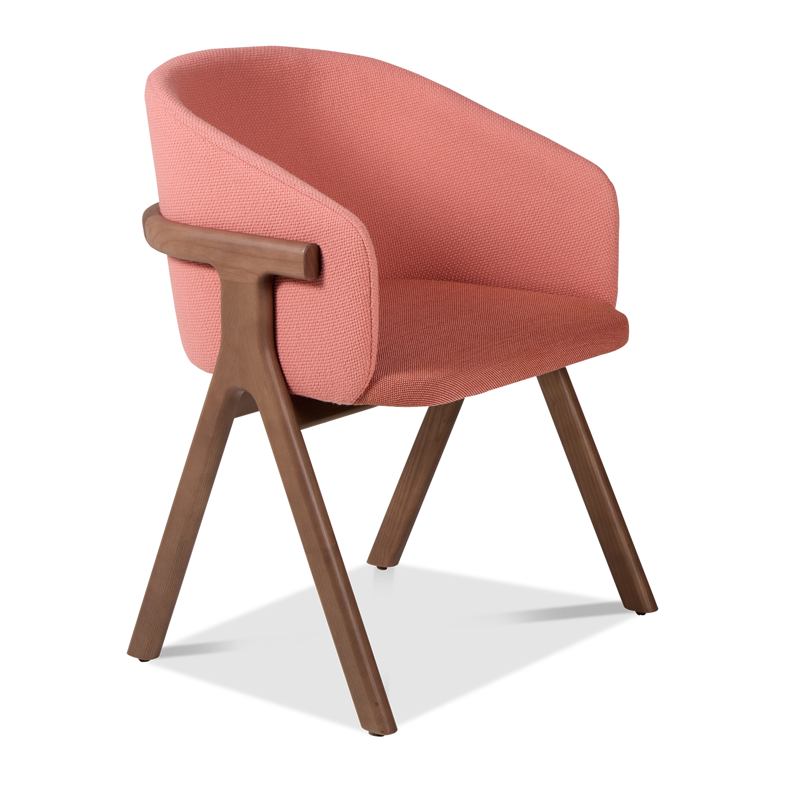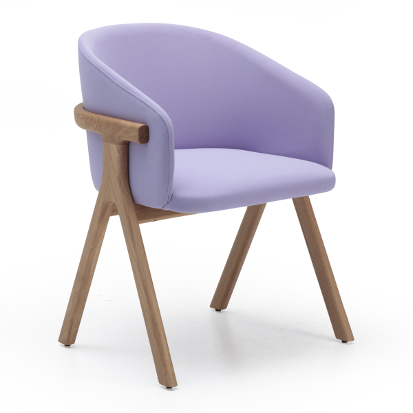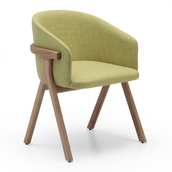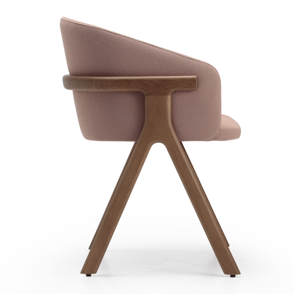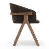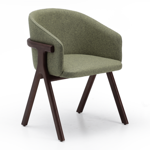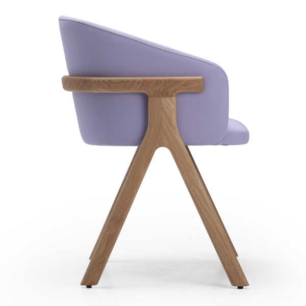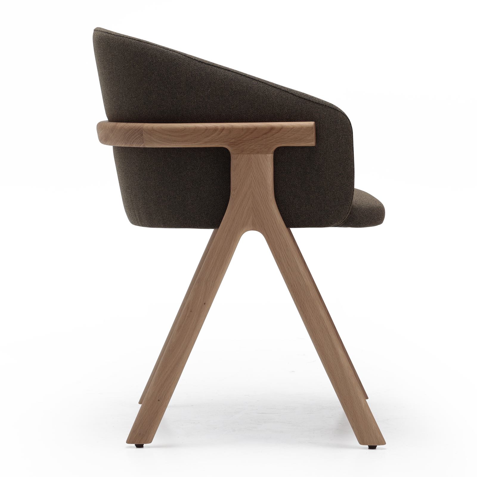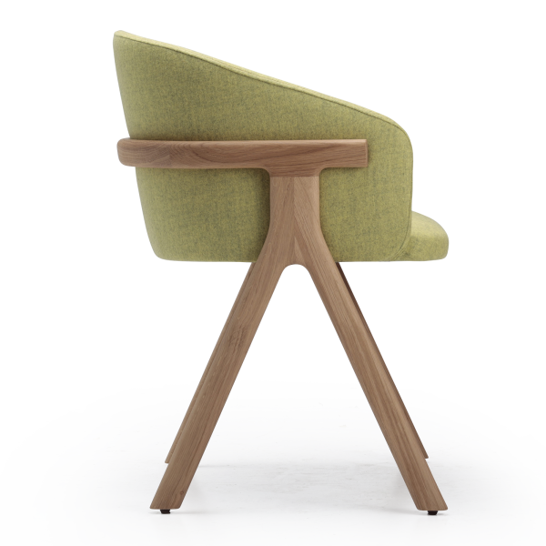 Der Stuhl Eora kombiniert Designstil mit Vintage-Einflüssen. Die breite, umhüllende Rückenlehne und die weichen, klaren Linien betonen die Kraft des Holzes.