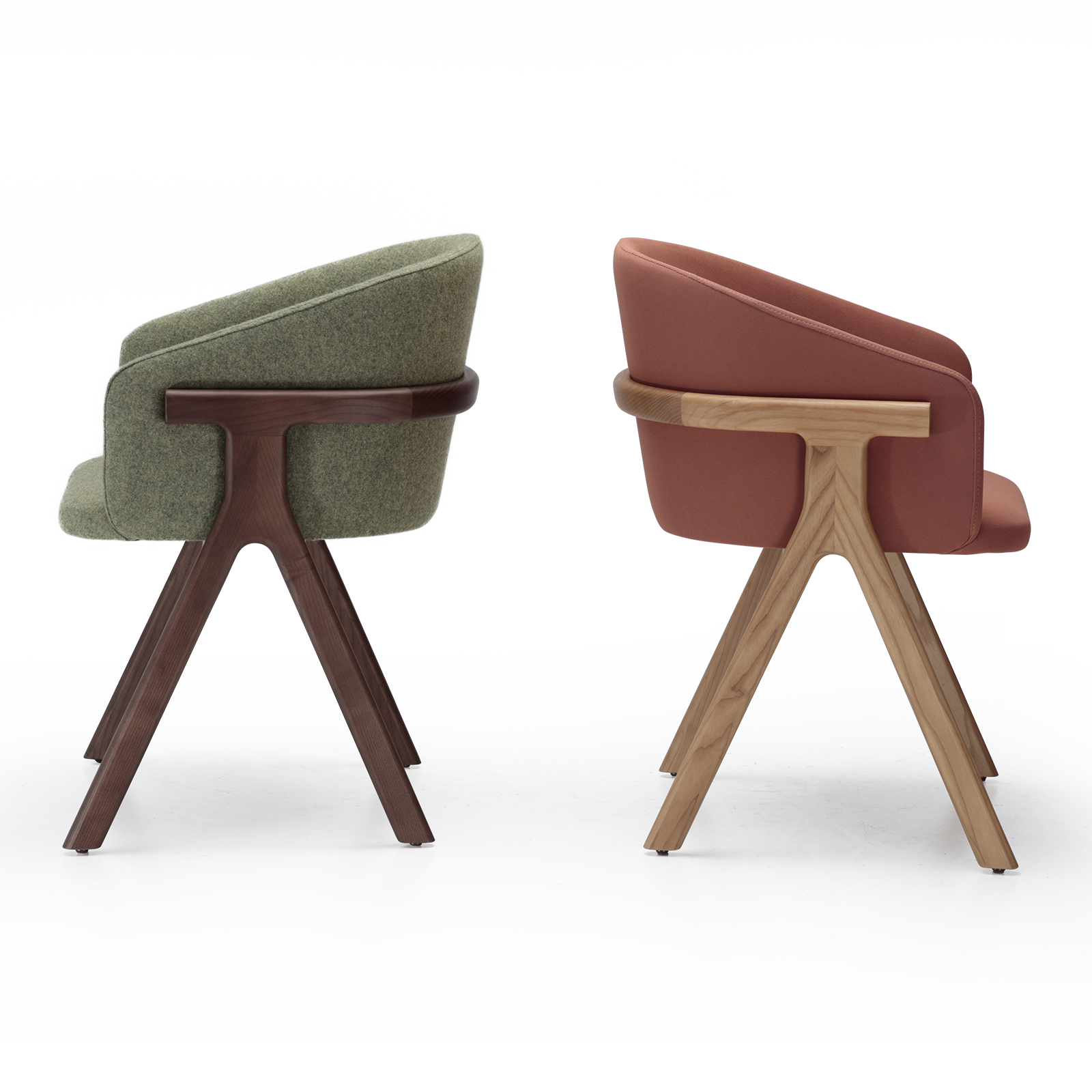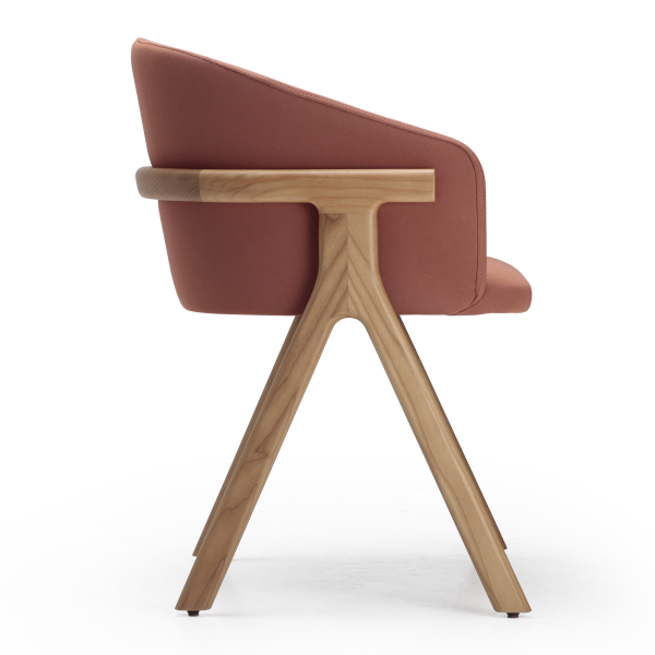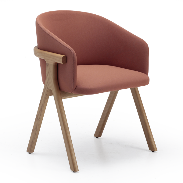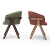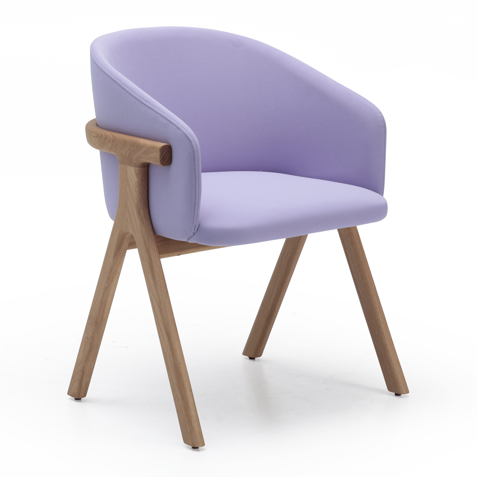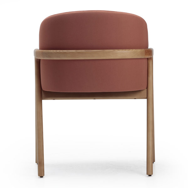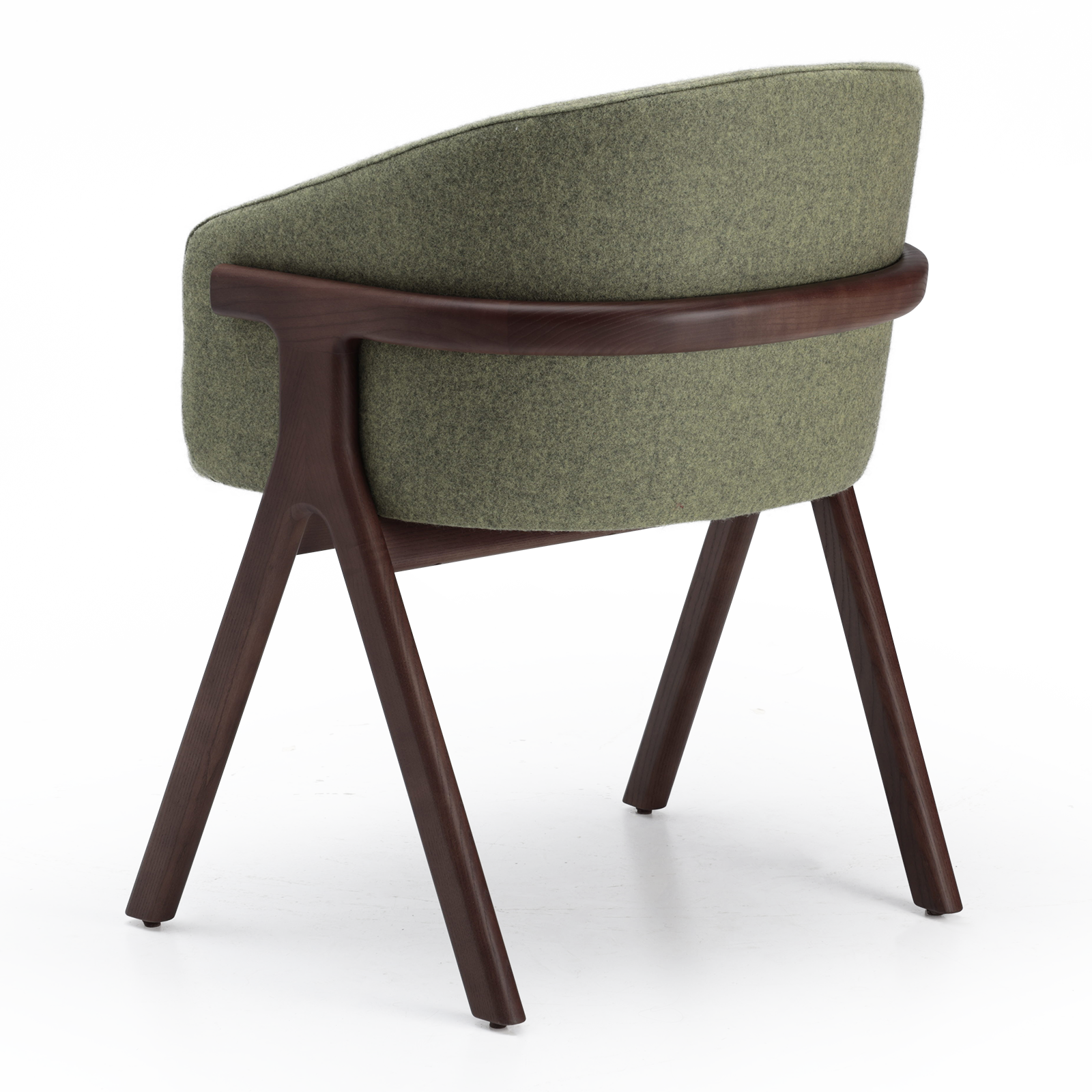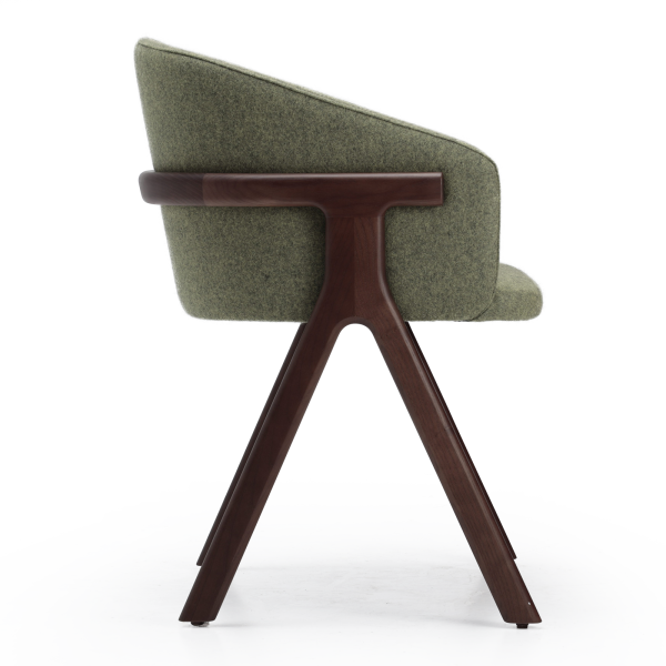 Der Stuhl Eora kombiniert Designstil mit Vintage-Einflüssen. Die breite, umhüllende Rückenlehne und die weichen, klaren Linien betonen die Kraft des Holzes.