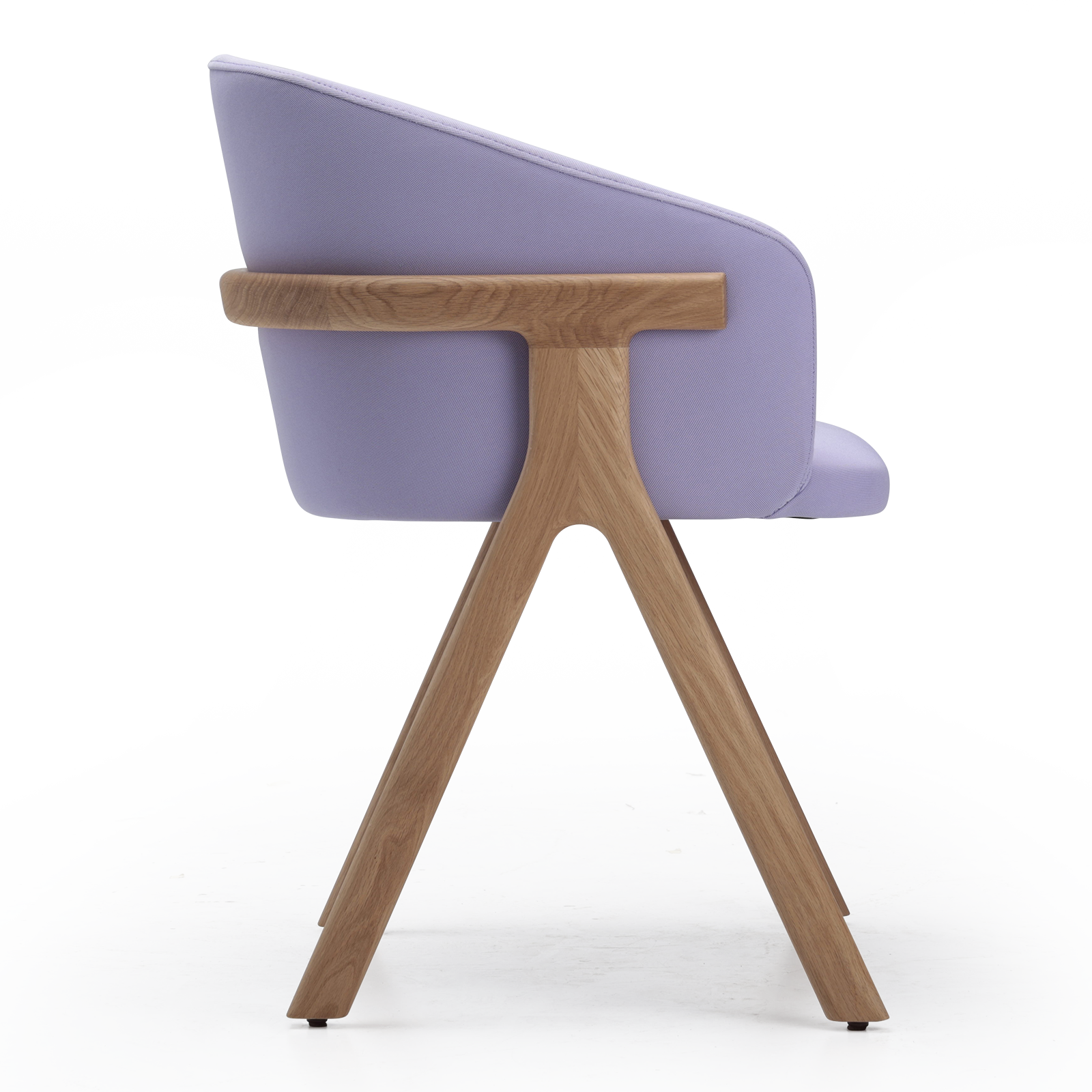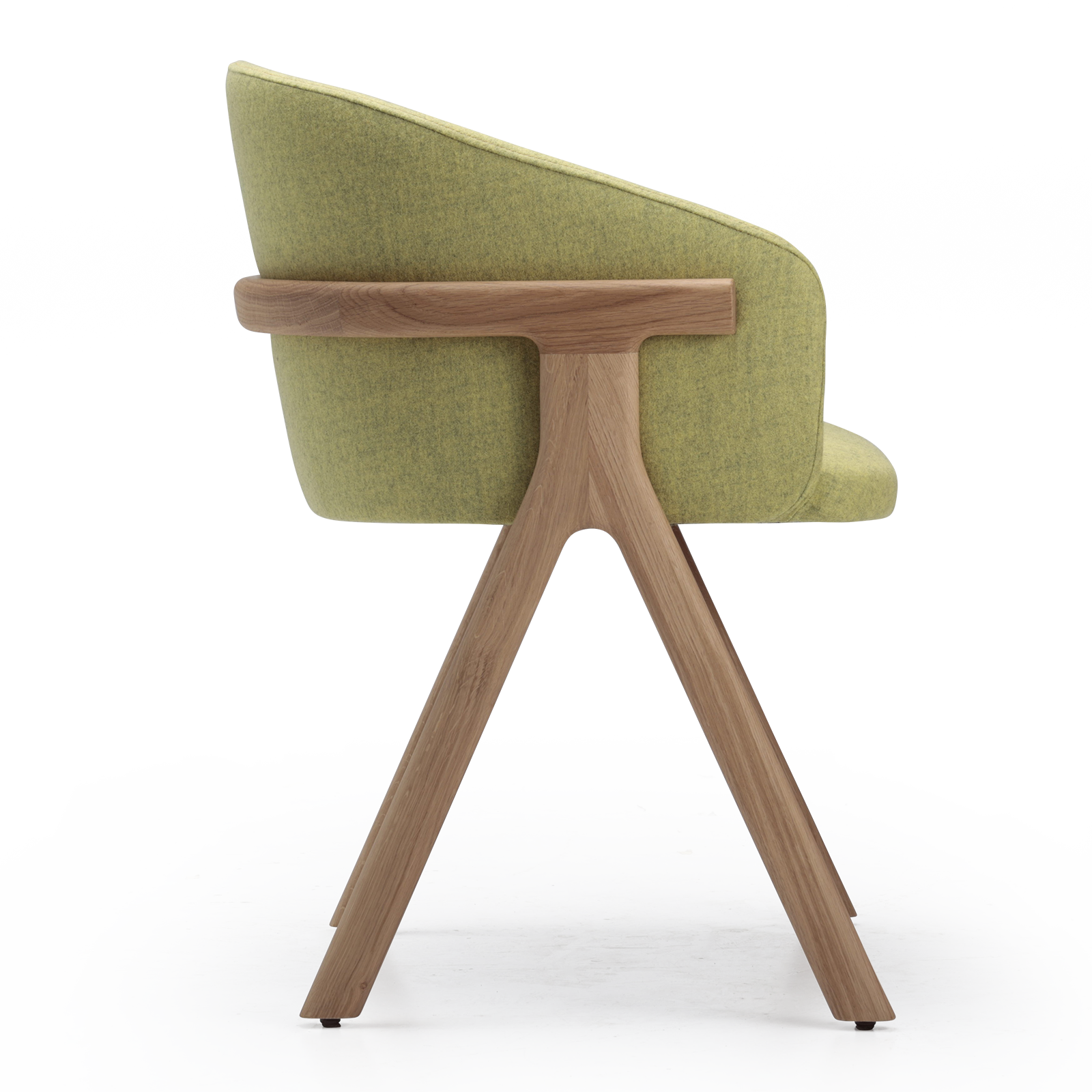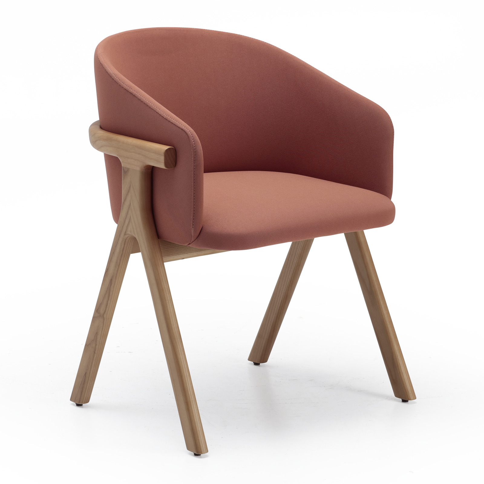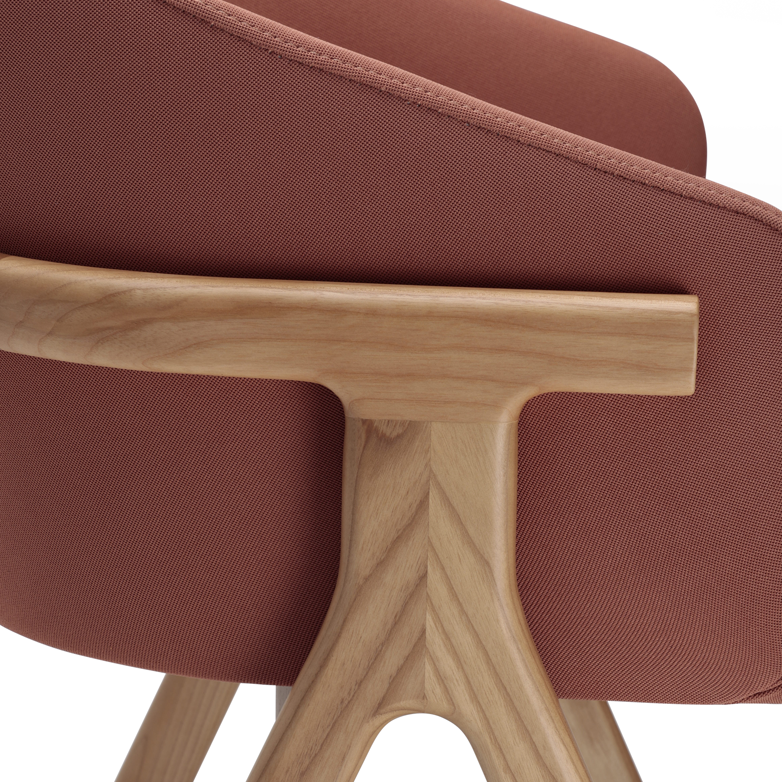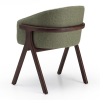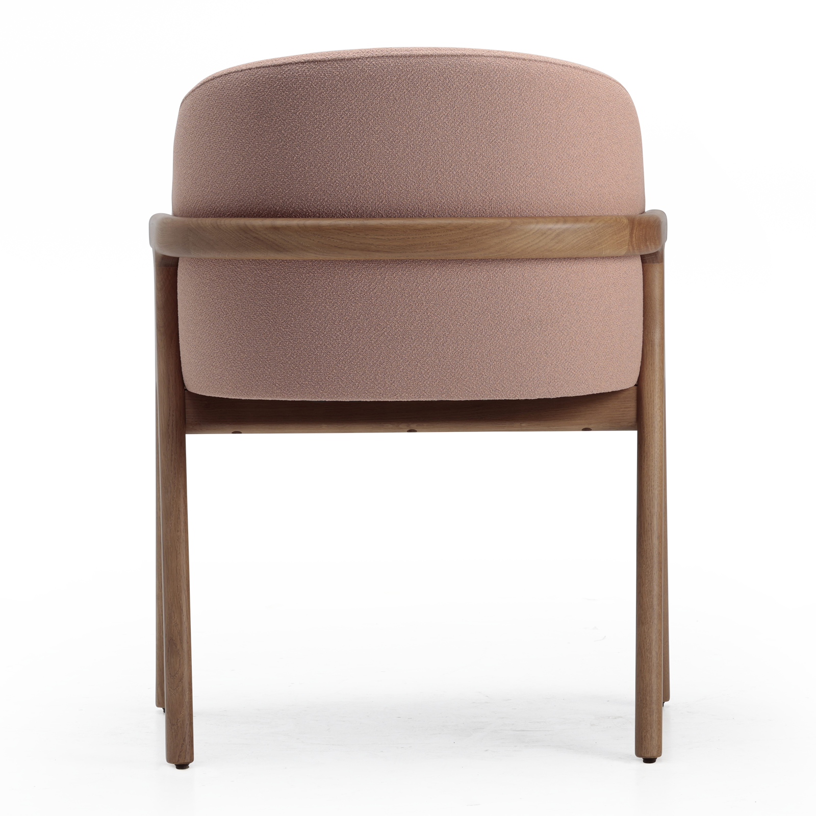Der Stuhl Eora kombiniert Designstil mit Vintage-Einflüssen. Die breite, umhüllende Rückenlehne und die weichen, klaren Linien betonen die Kraft des Holzes.