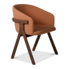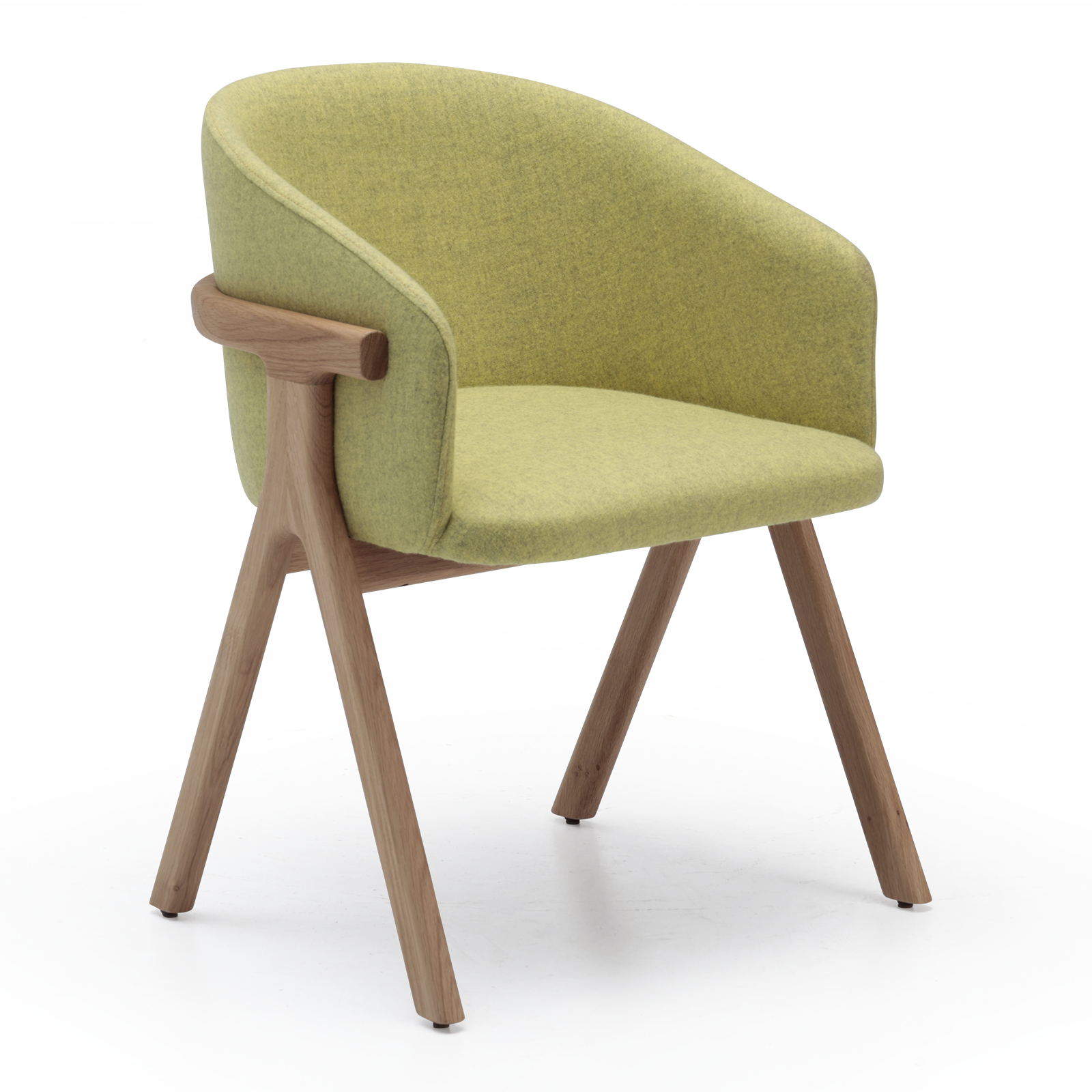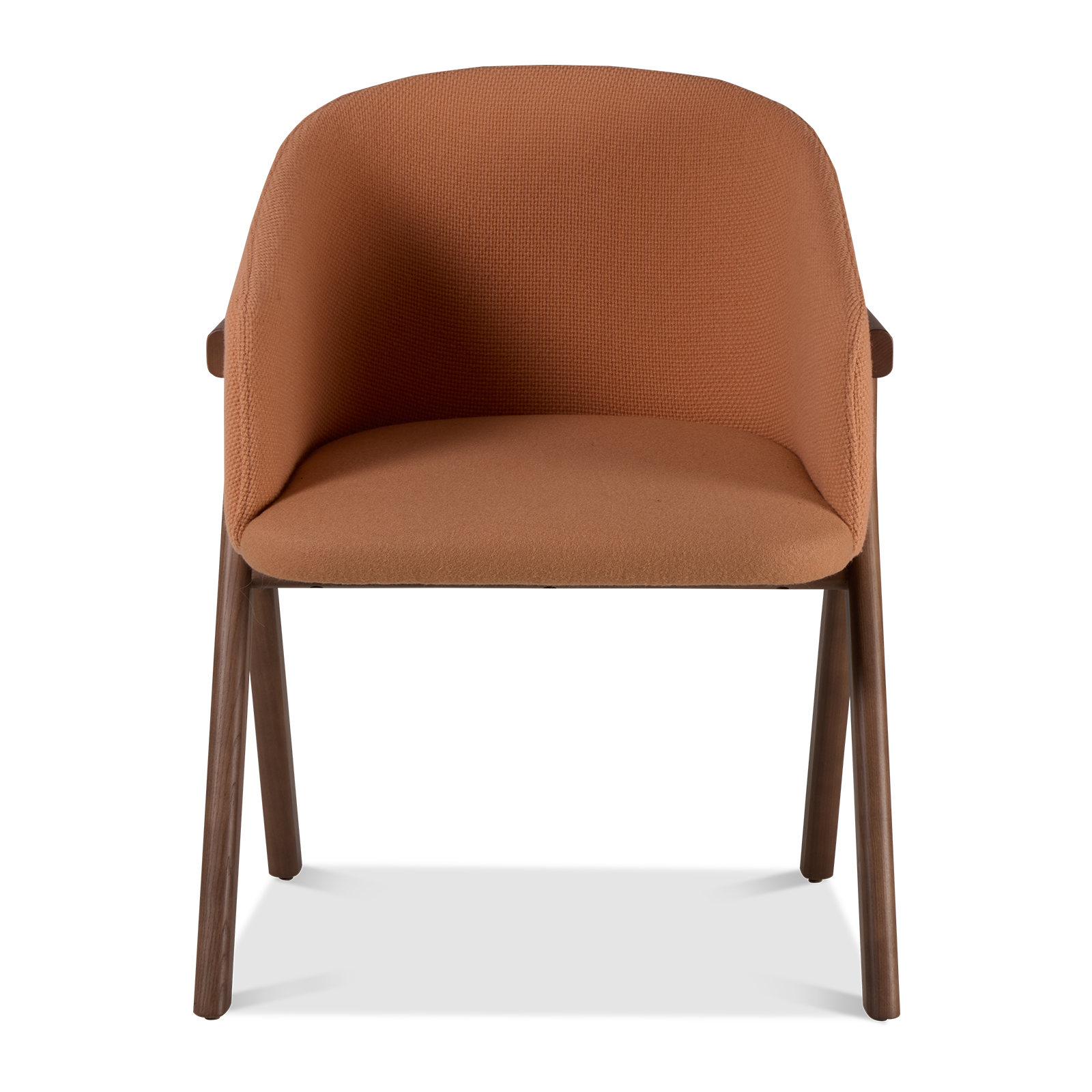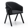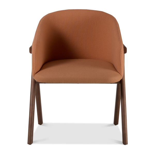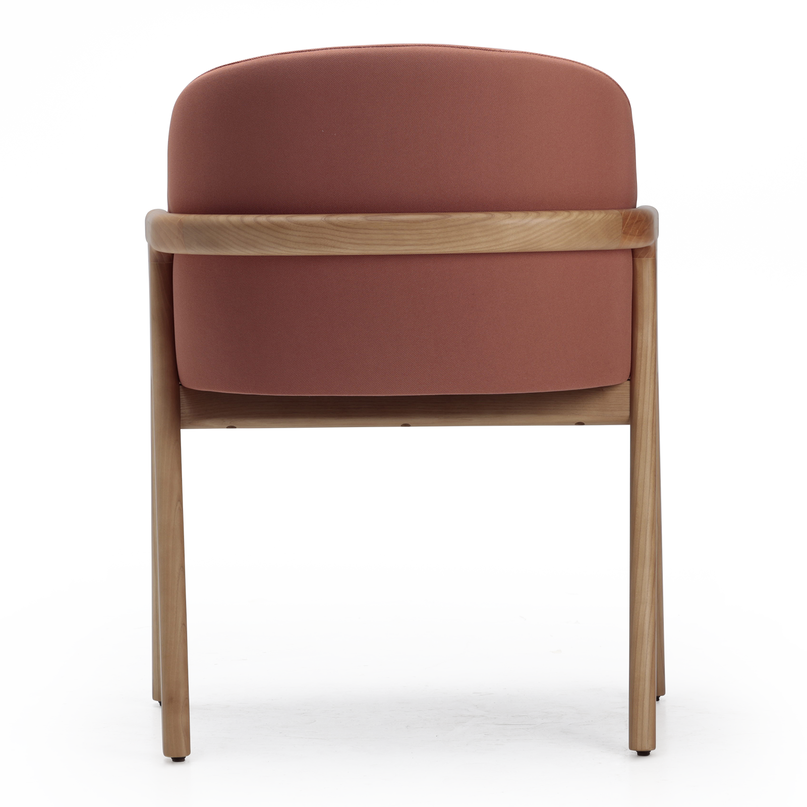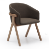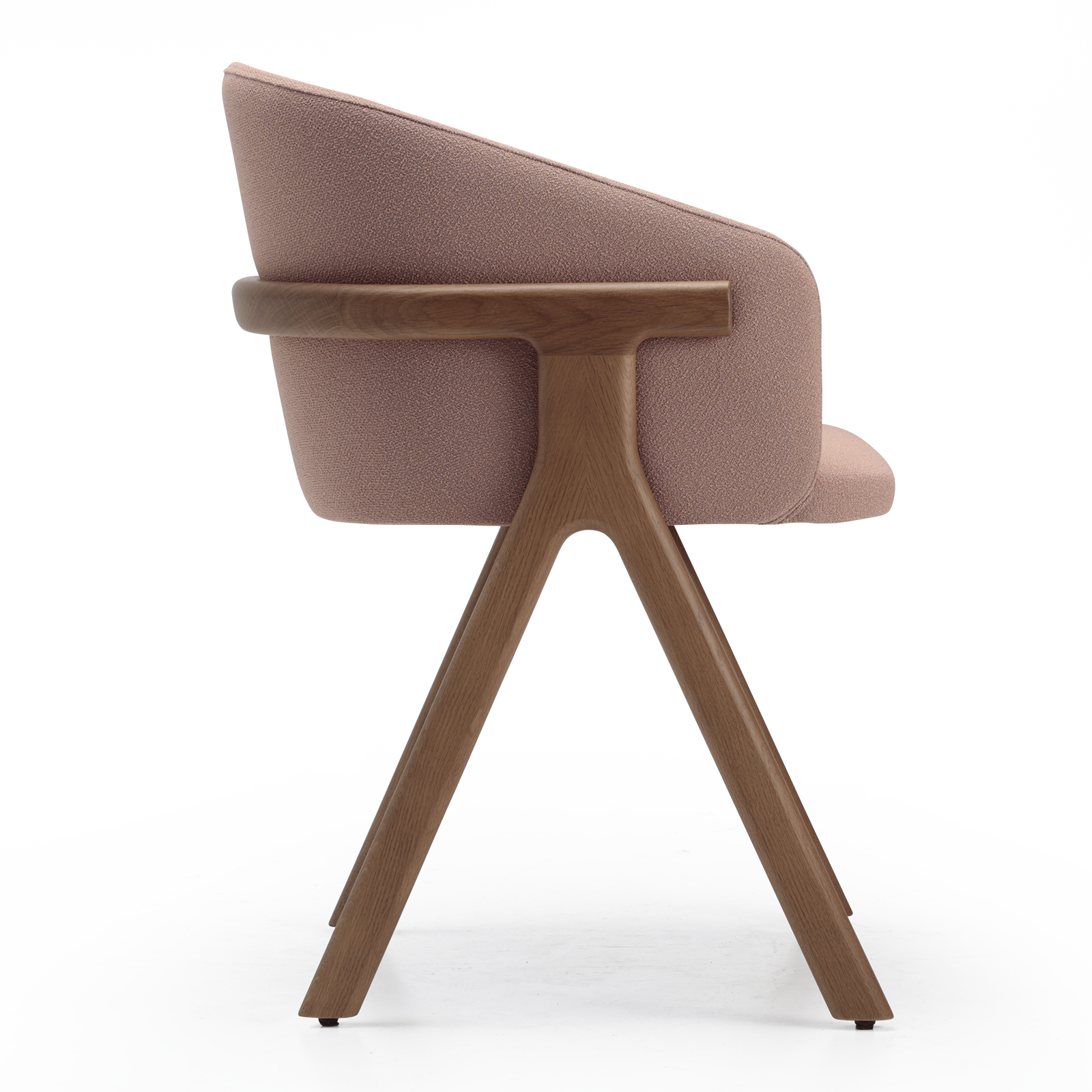 Der Stuhl Eora kombiniert Designstil mit Vintage-Einflüssen. Die breite, umhüllende Rückenlehne und die weichen, klaren Linien betonen die Kraft des Holzes.