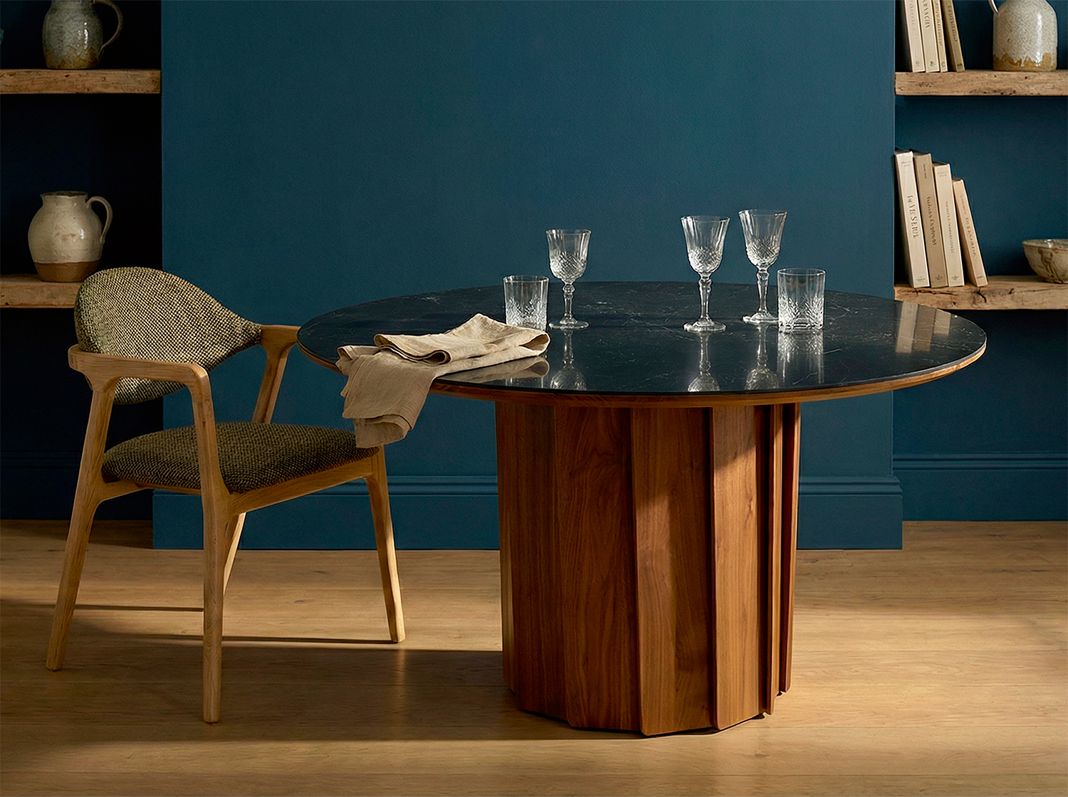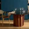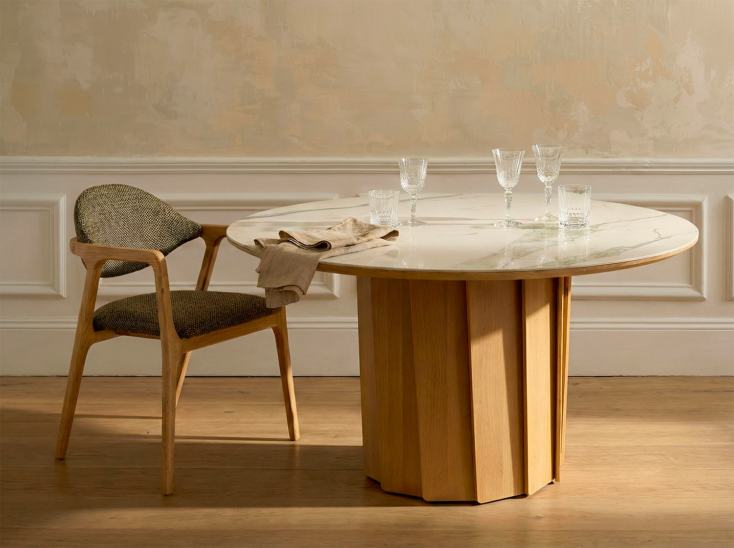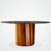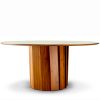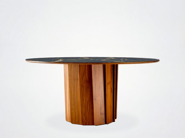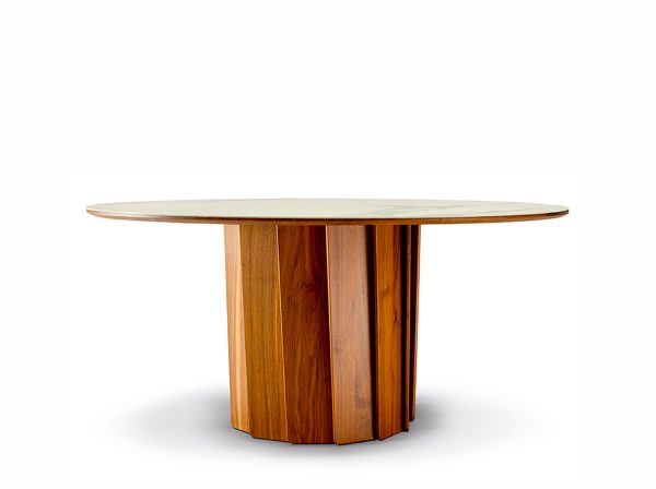 Der Tisch Volute ist ein starkes Stück mit einem besonderen Design: seine Linie wurde von dem französischen Designer Pierre Dubourg entworfen, der den Bistrotisch, einen Klassiker des französischen Lebensgefühls, neu interpretieren wollte. Der Tisch hat eine runde Tischplatte und einen zentralen Fuß. Dieser Fuß ist eine große technische und ästhetische Innovation: Er besteht aus einer Reihe von Massivholzleisten, die einen kinetischen Effekt erzeugen, indem sie Licht und Schatten abwechseln.